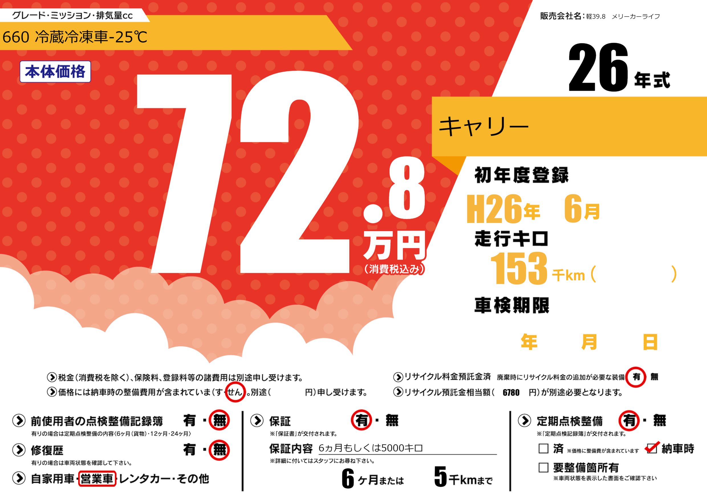 | 走行キロ | 15.3万km | 初年度登録 | H26年6月 |