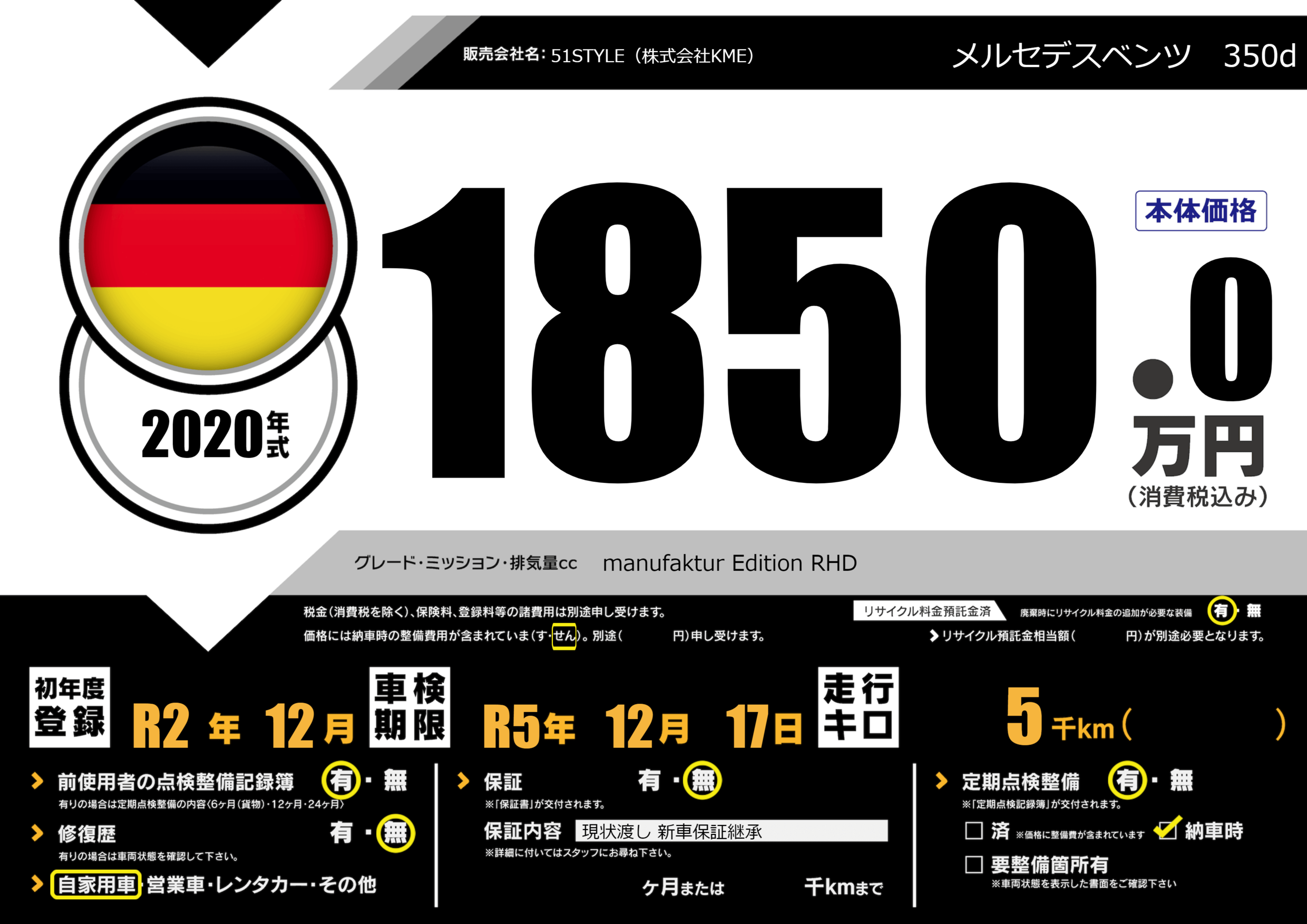 | 車名 | メルセデスベンツ 350d | グレード ミッション 排気量 |