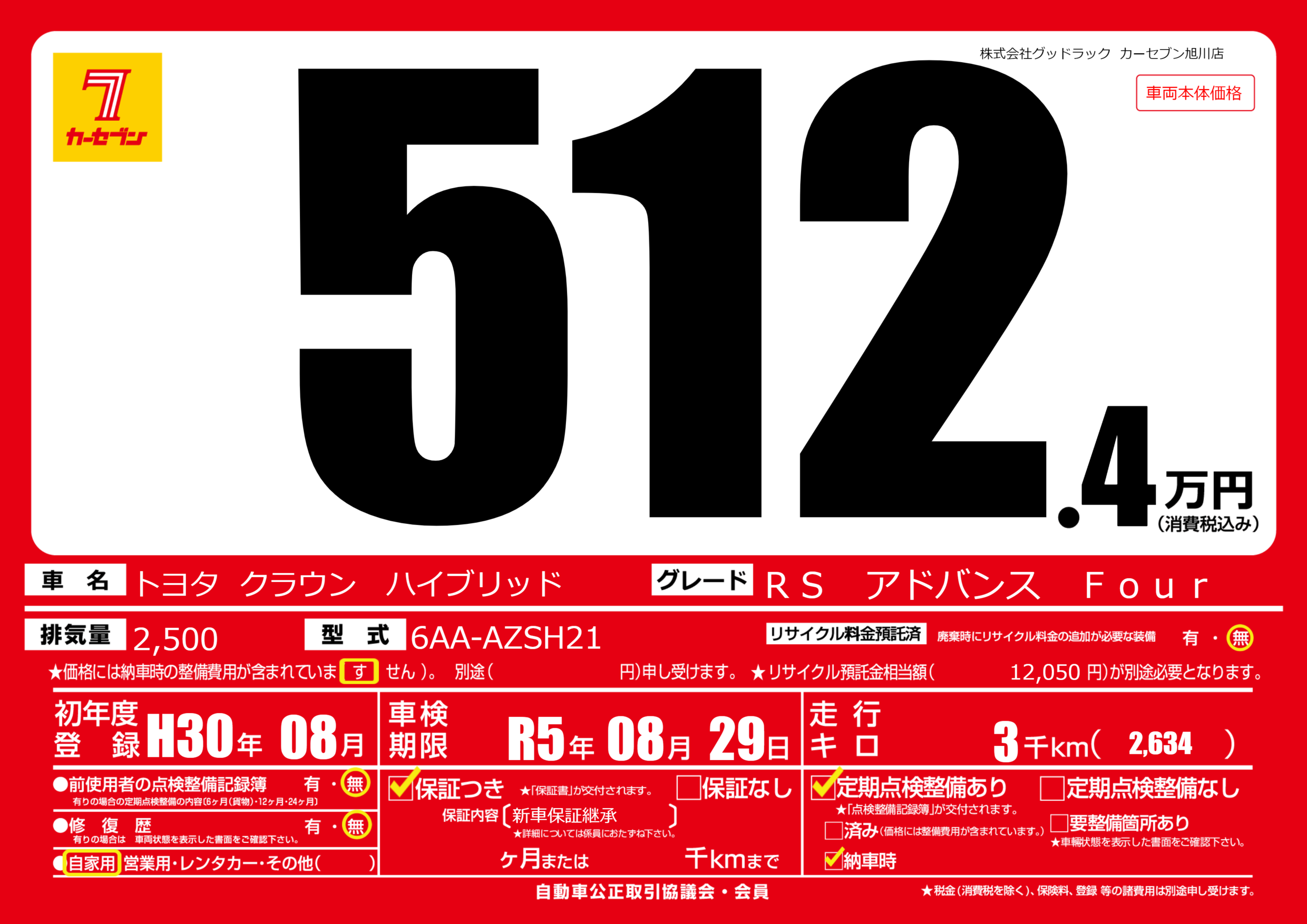 | 走行キロ | 0.3万km | 初年度登録 | H30年08月 |