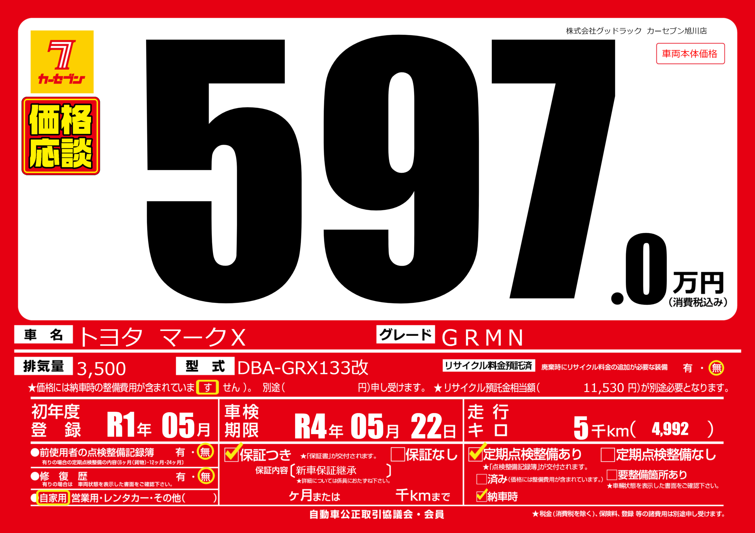 | 車名 | トヨタ マークX | グレード ミッション 排気量 |