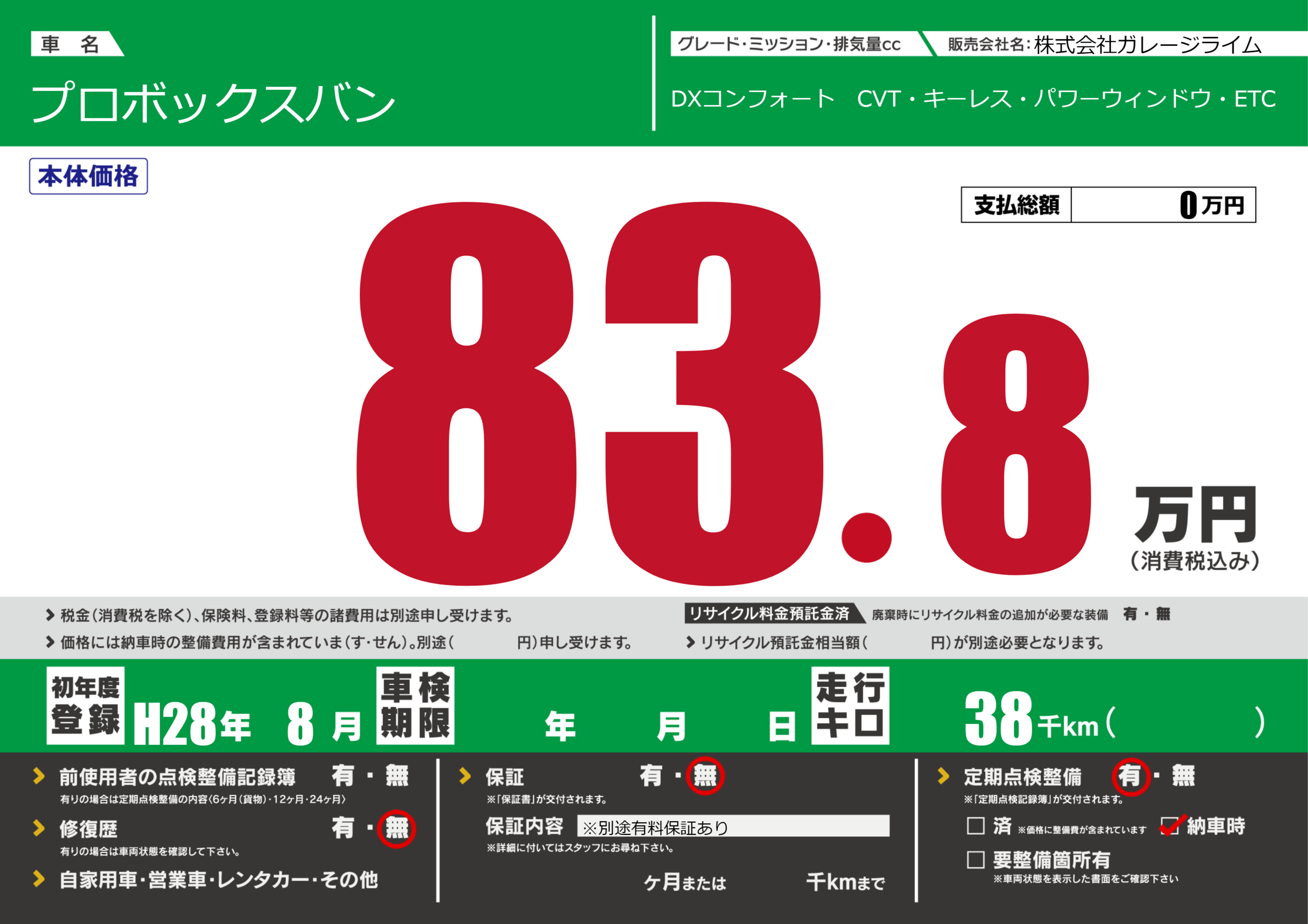 | 車名 | プロボックスバン | グレード ミッション 排気量 |
