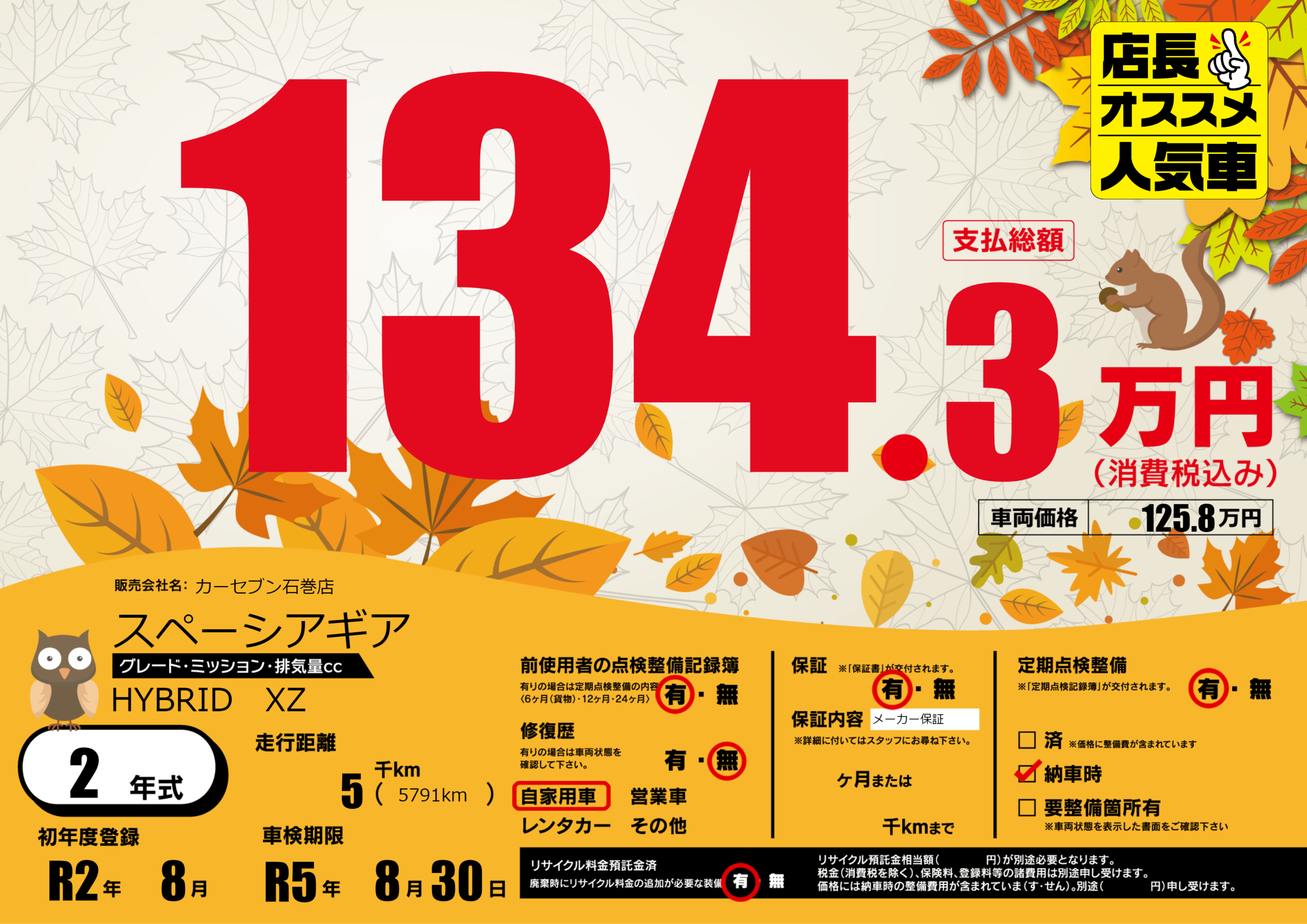 | 走行キロ | 0.5万km | 初年度登録 | R2年8月 |