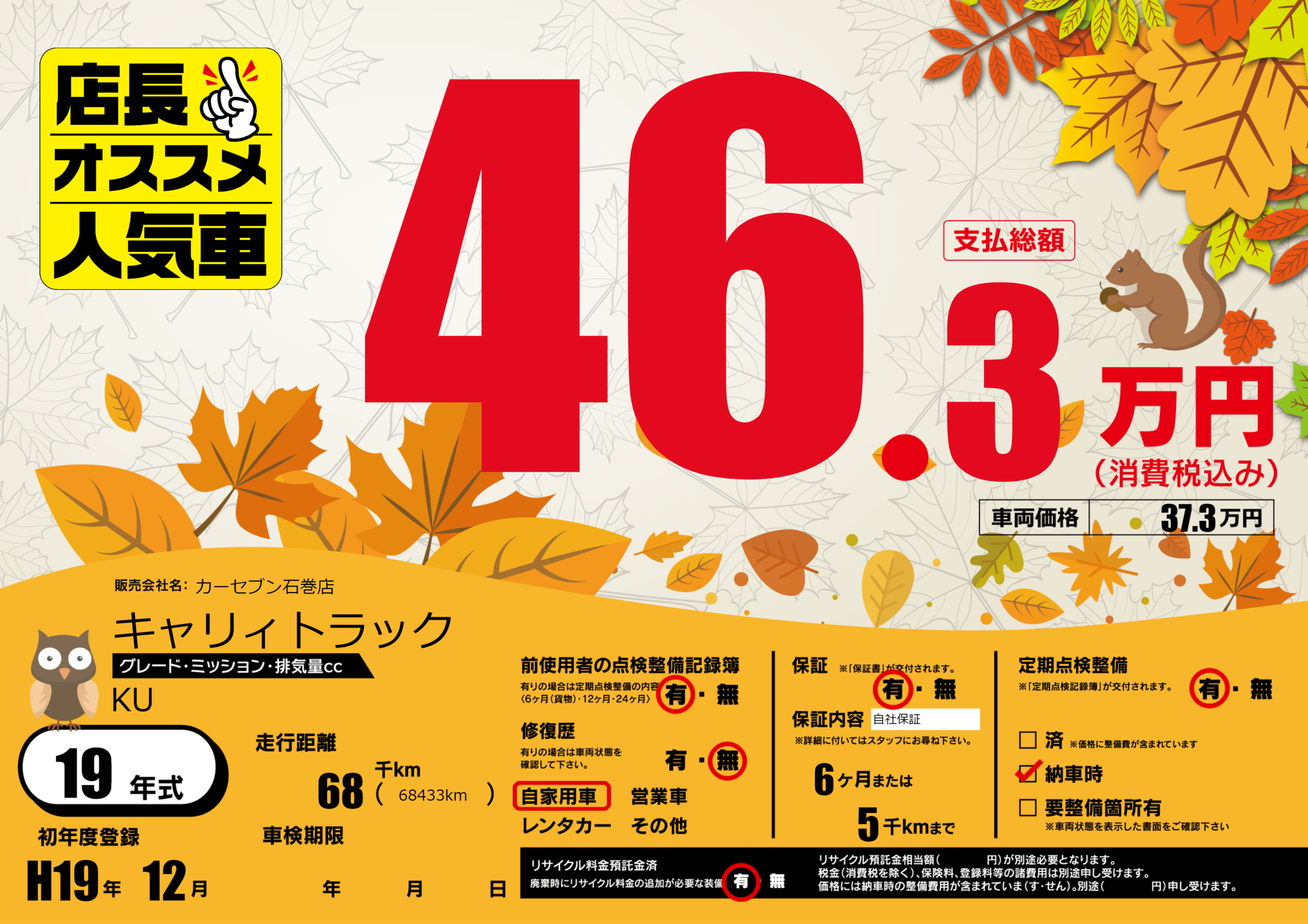 | 車名 | キャリィトラック | グレード ミッション 排気量 |