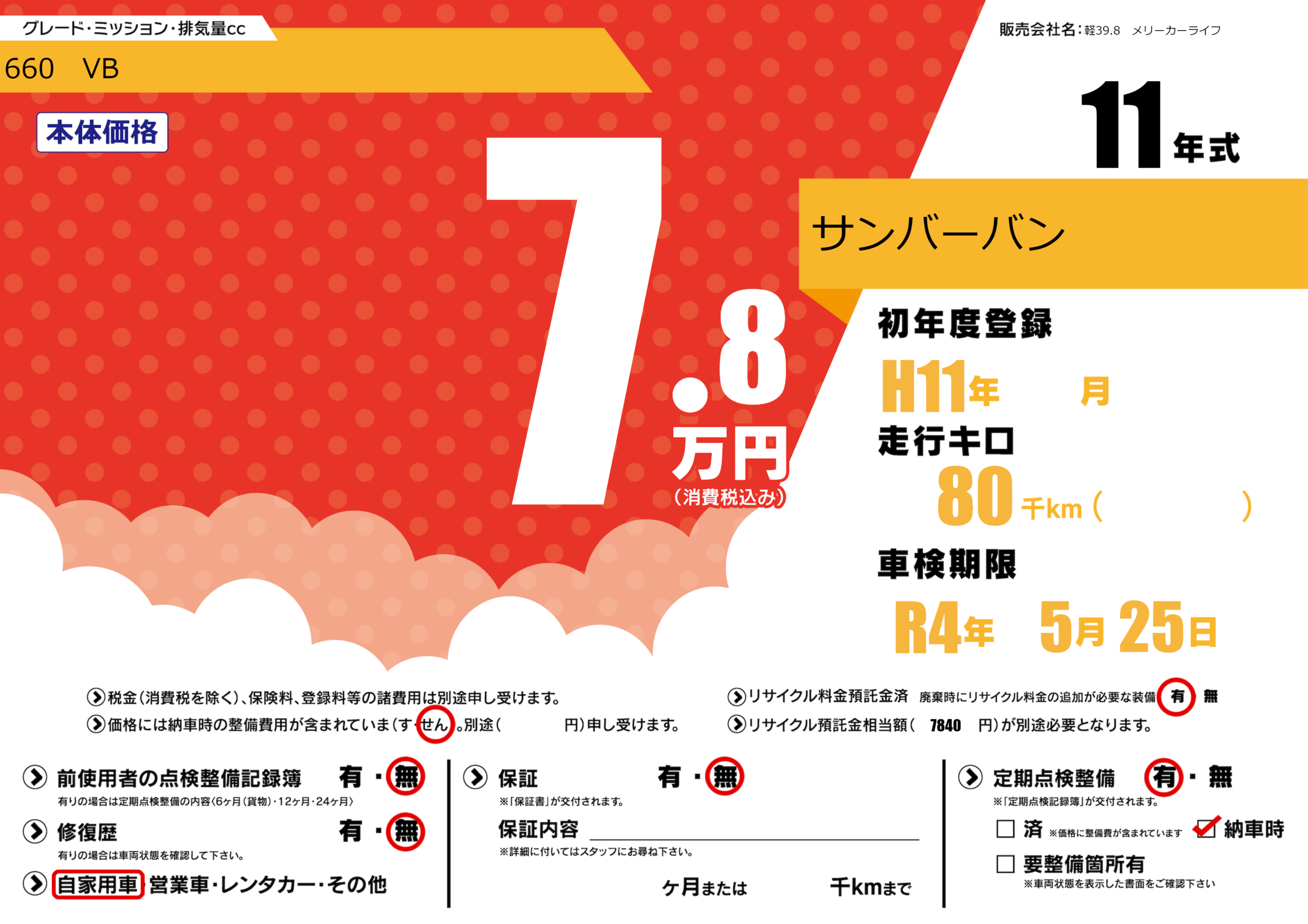 | 走行キロ | 8万km | 初年度登録 | H11年---月 |