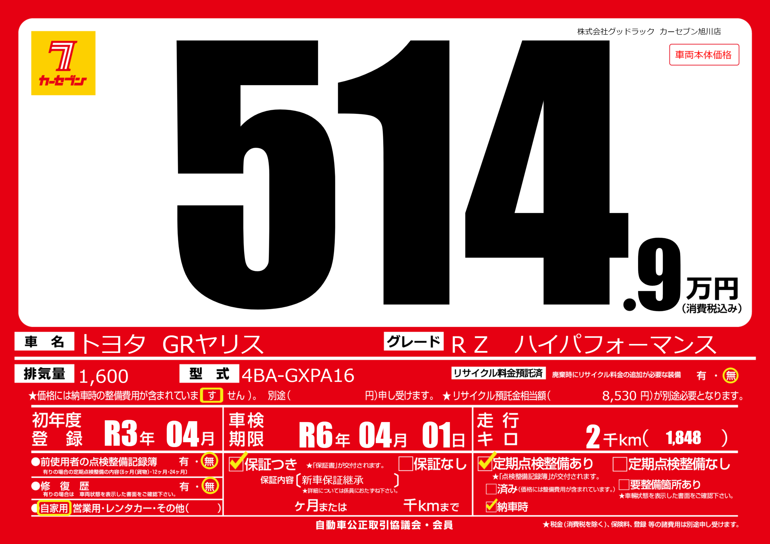 | 車名 | トヨタ GRヤリス | グレード ミッション 排気量 |