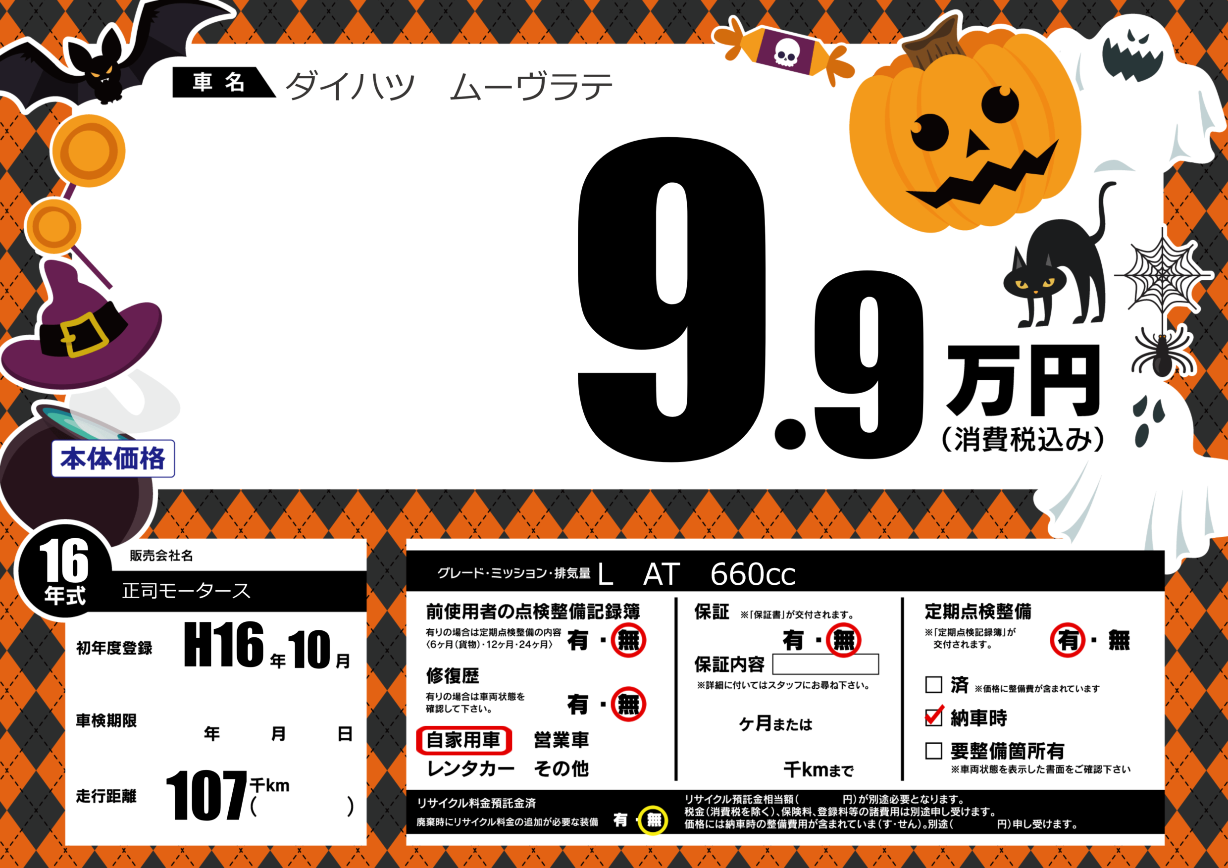 | 定期点検整備 | 定期点検整備あり 納車時あり | ||