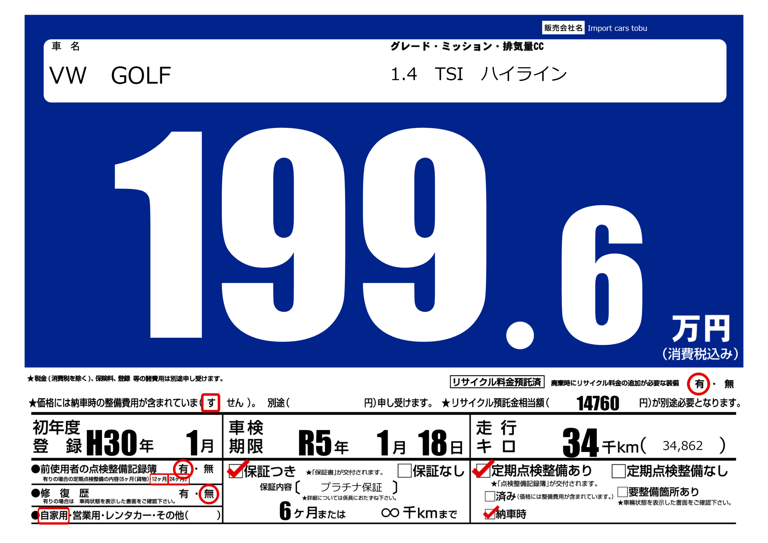| 車名 | VW GOLF | グレード ミッション 排気量 |