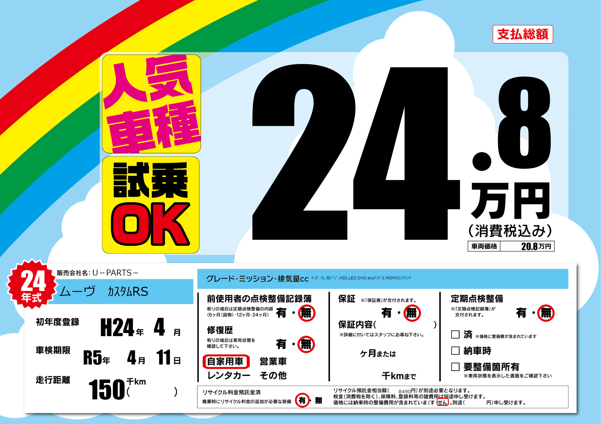 | 走行キロ | 15万km | 初年度登録 | H24年4月 |