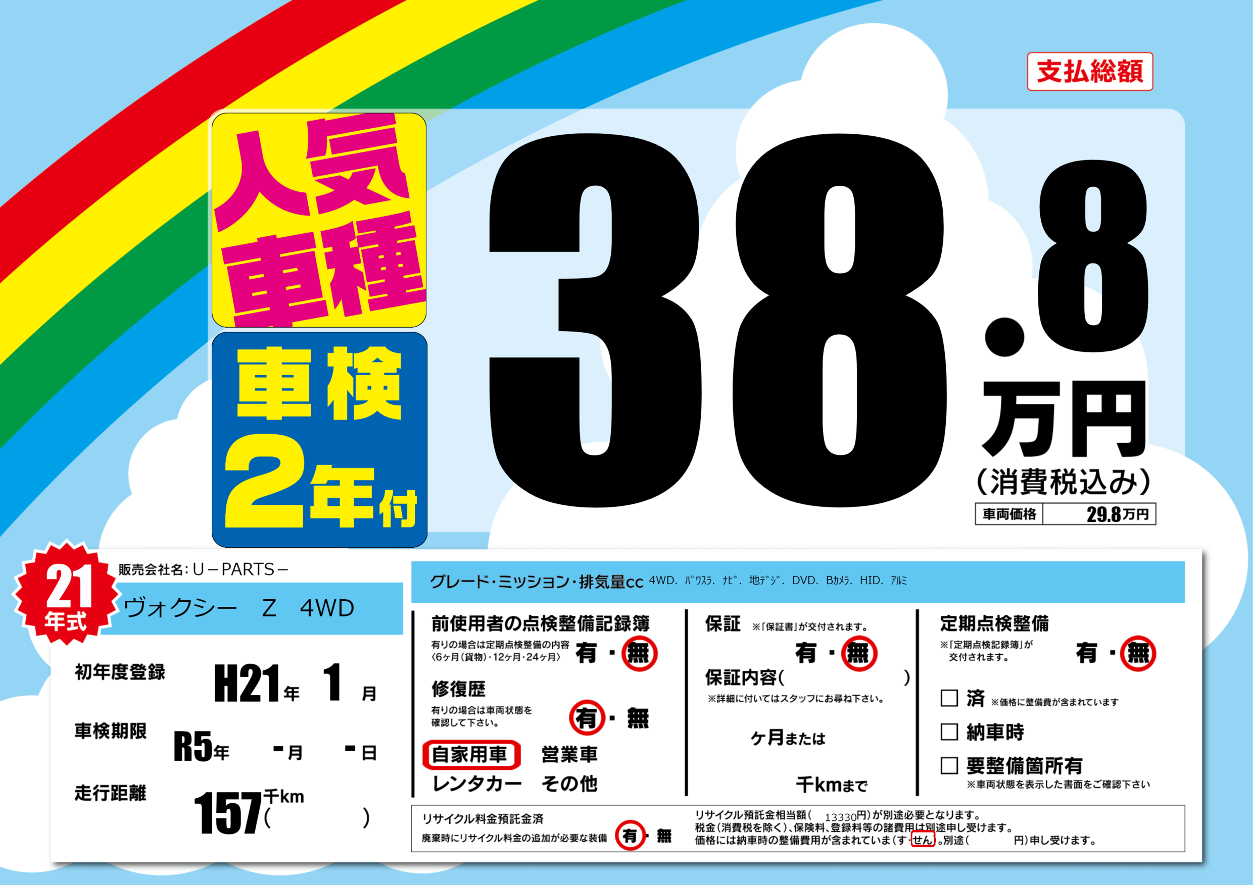 | 車名 | ヴォクシー Z 4WD | グレード ミッション 排気量 |