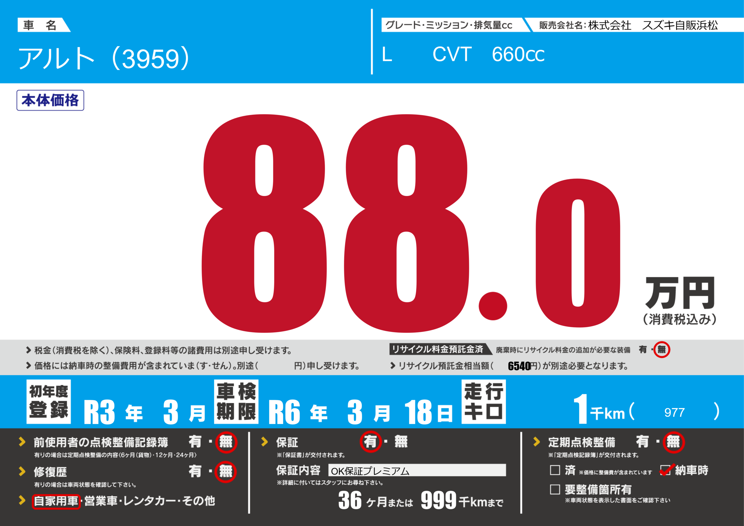 保証付き 保証内容(OK保証プレミアム) 36ヶ月または(999)千kmまで |