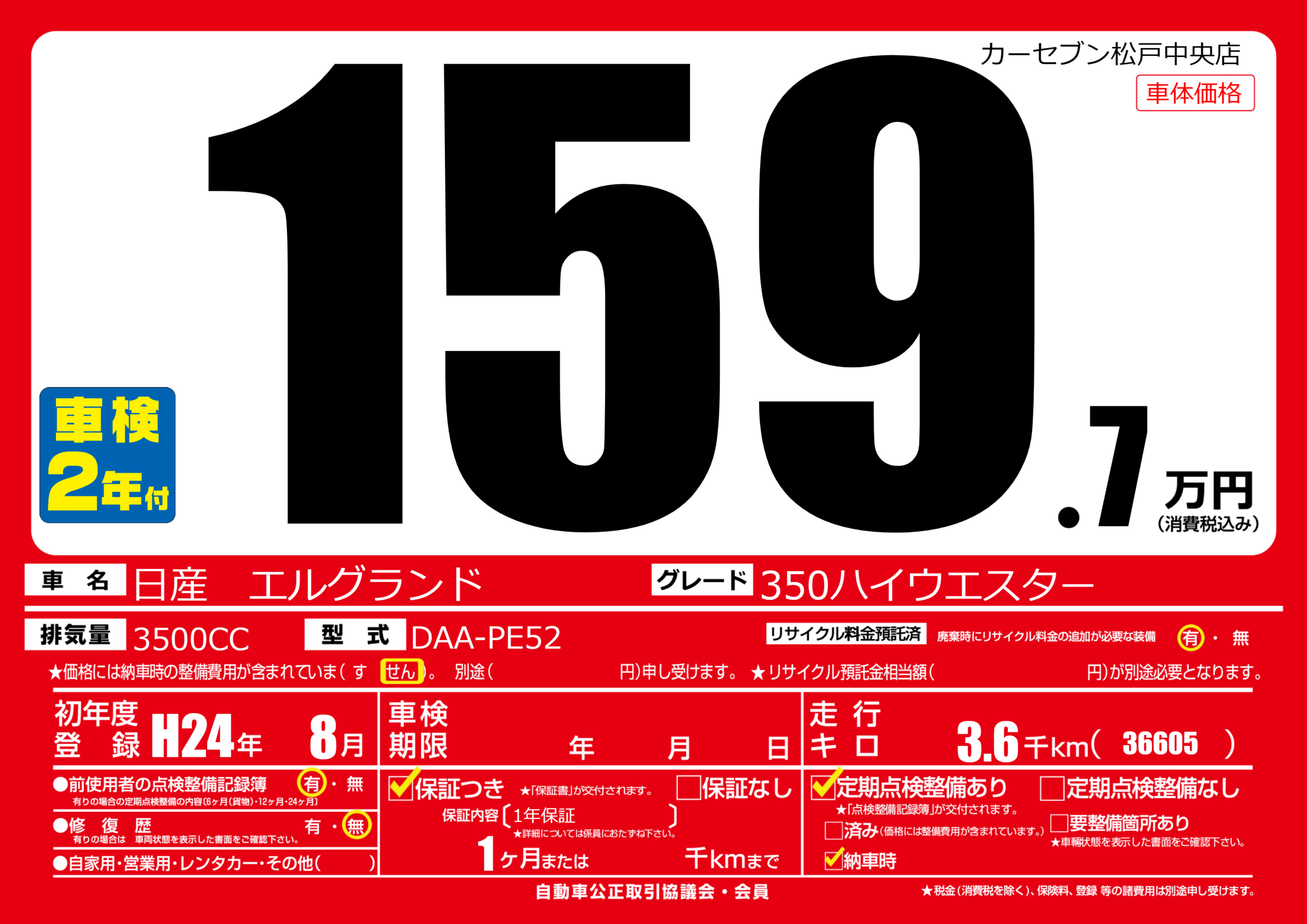 | 車名 | 日産 エルグランド | グレード ミッション 排気量 |