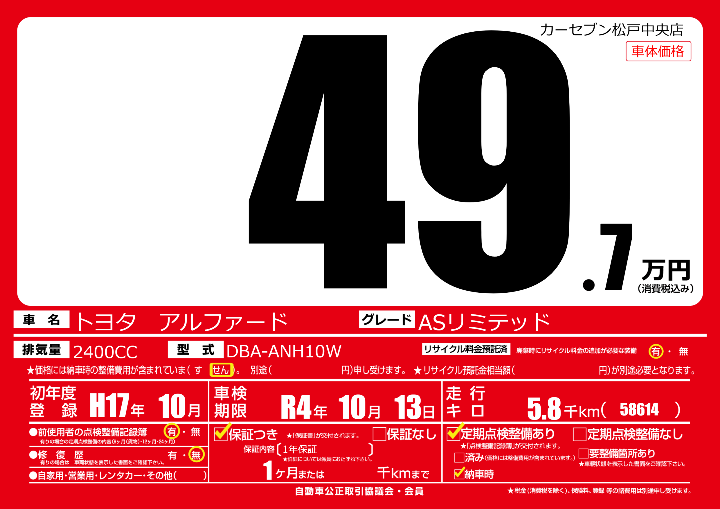 | 車名 | トヨタ アルファード | グレード ミッション 排気量 |