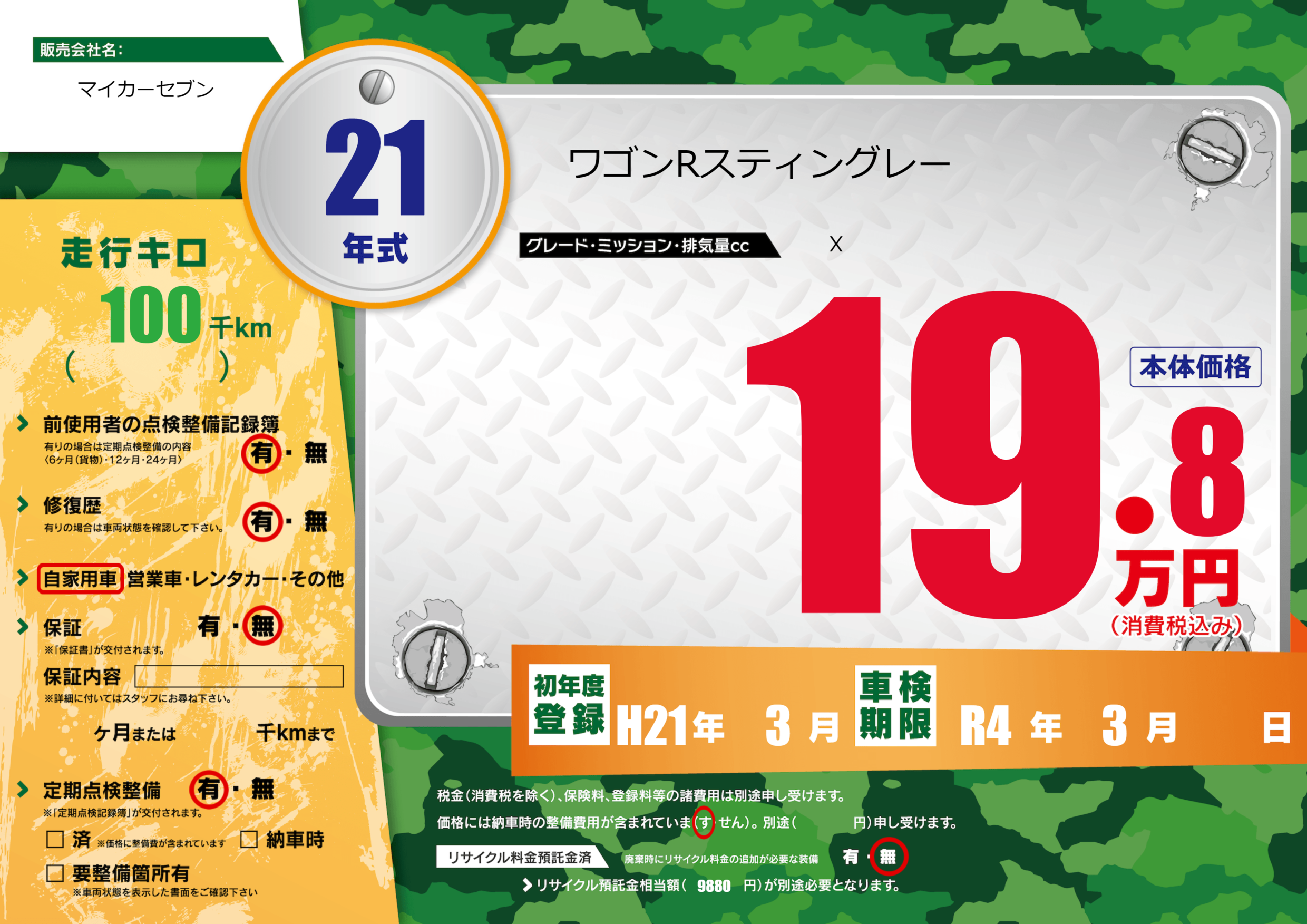 | 走行キロ | 10万km | 初年度登録 | H21年3月 |