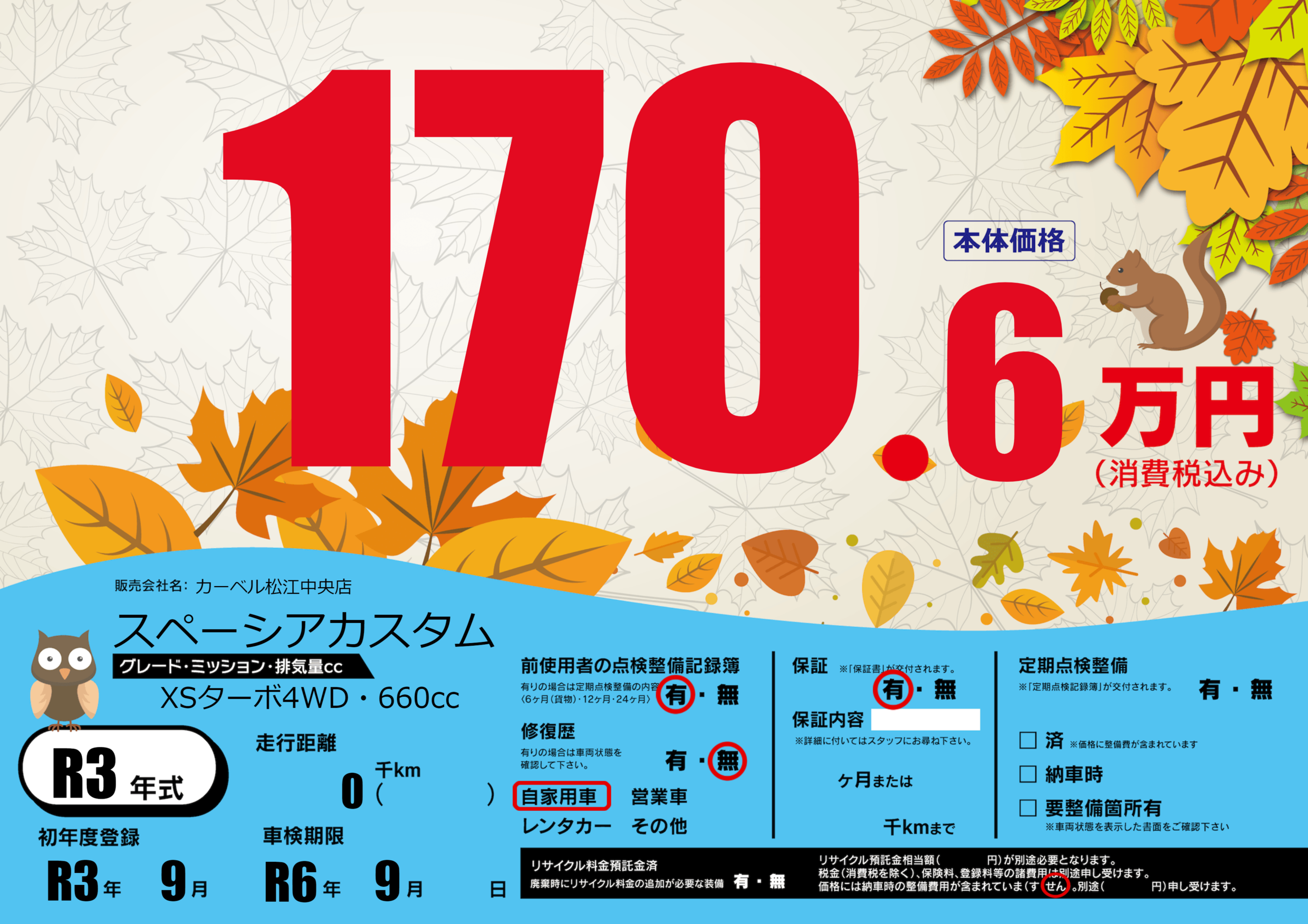 | 車検制限 | R6年 9月 - 日 | ||