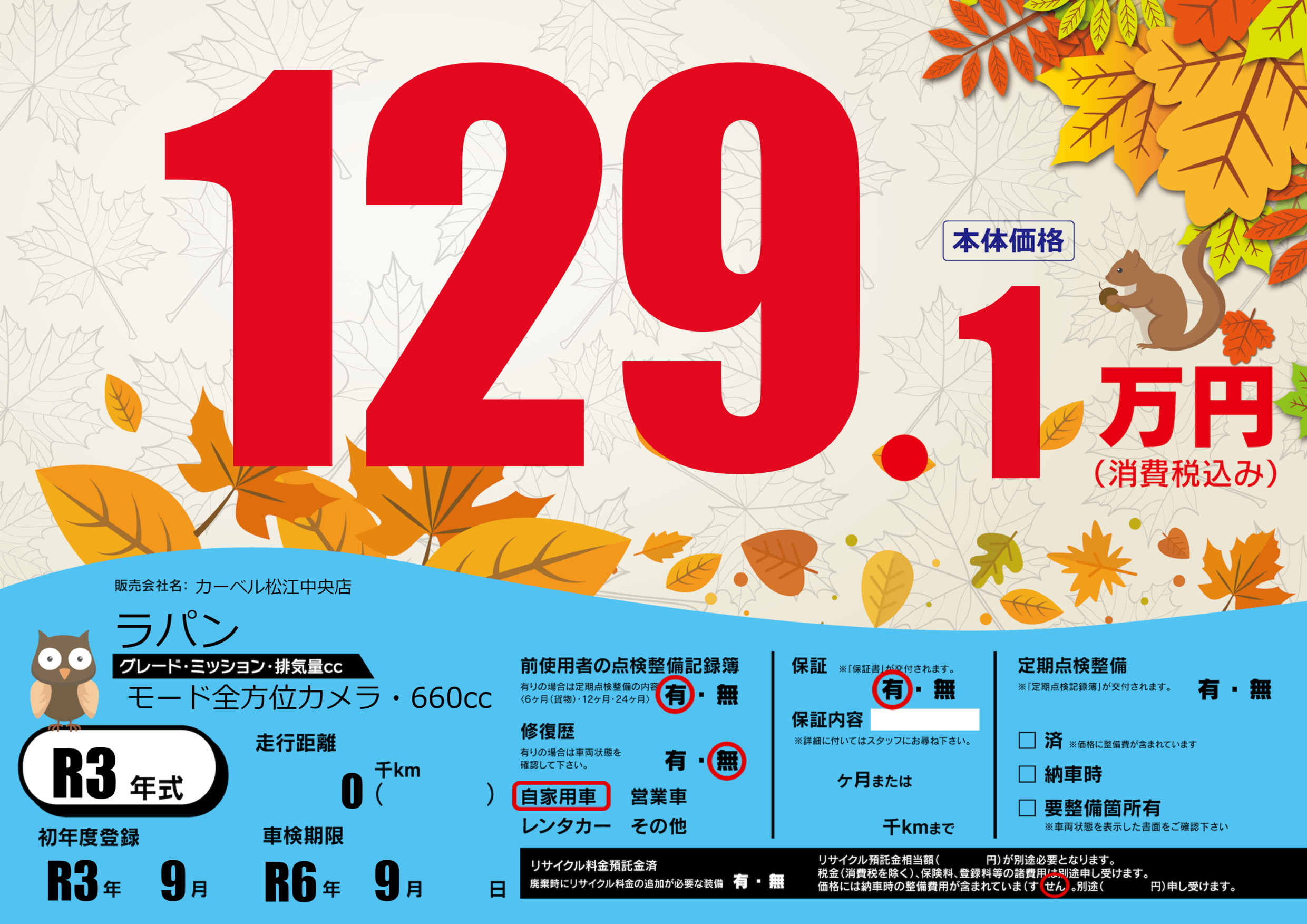 | 走行キロ | - | 初年度登録 | R3年9月 |