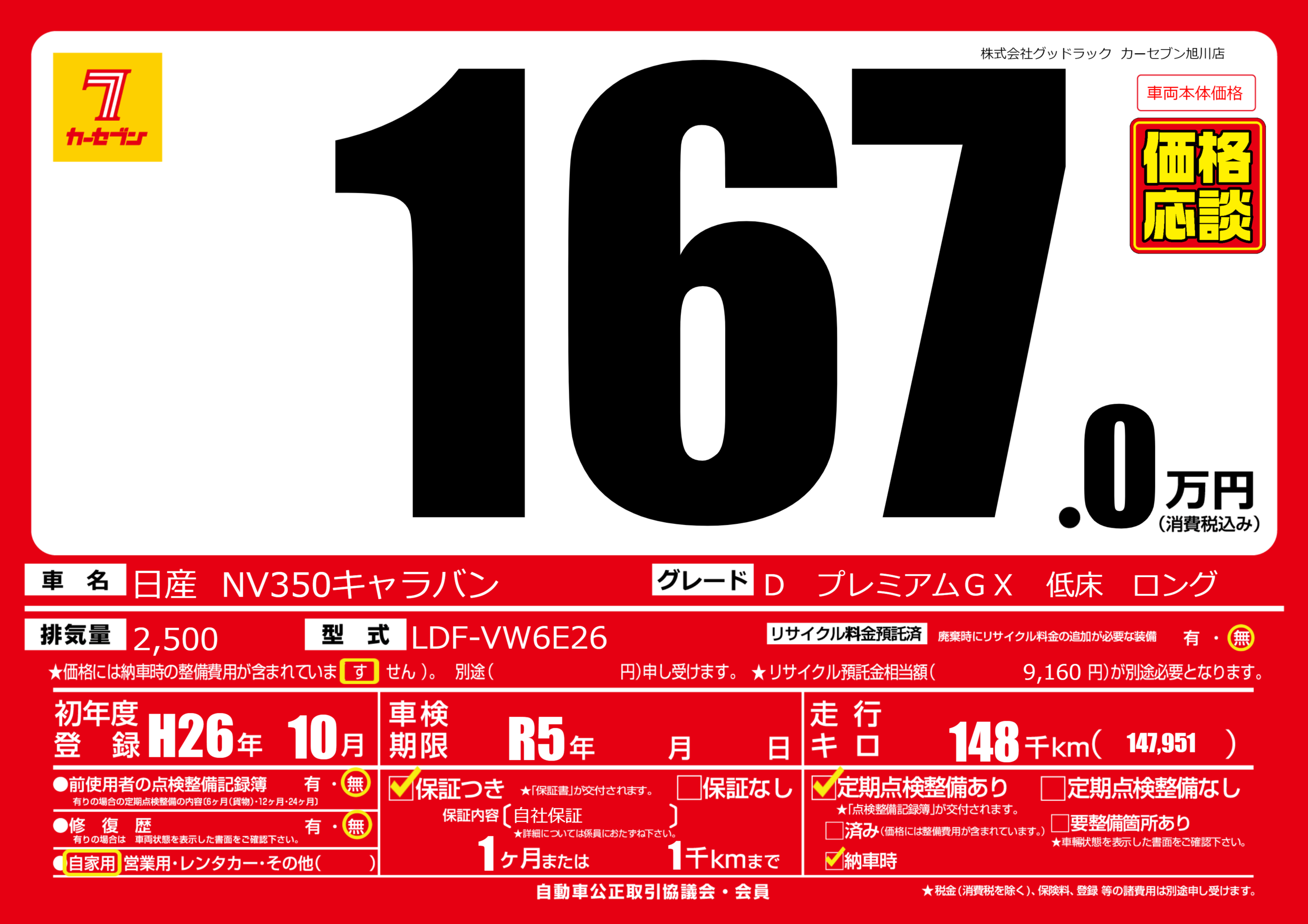 | 走行キロ | 14.8万km | 初年度登録 | H26年10月 |