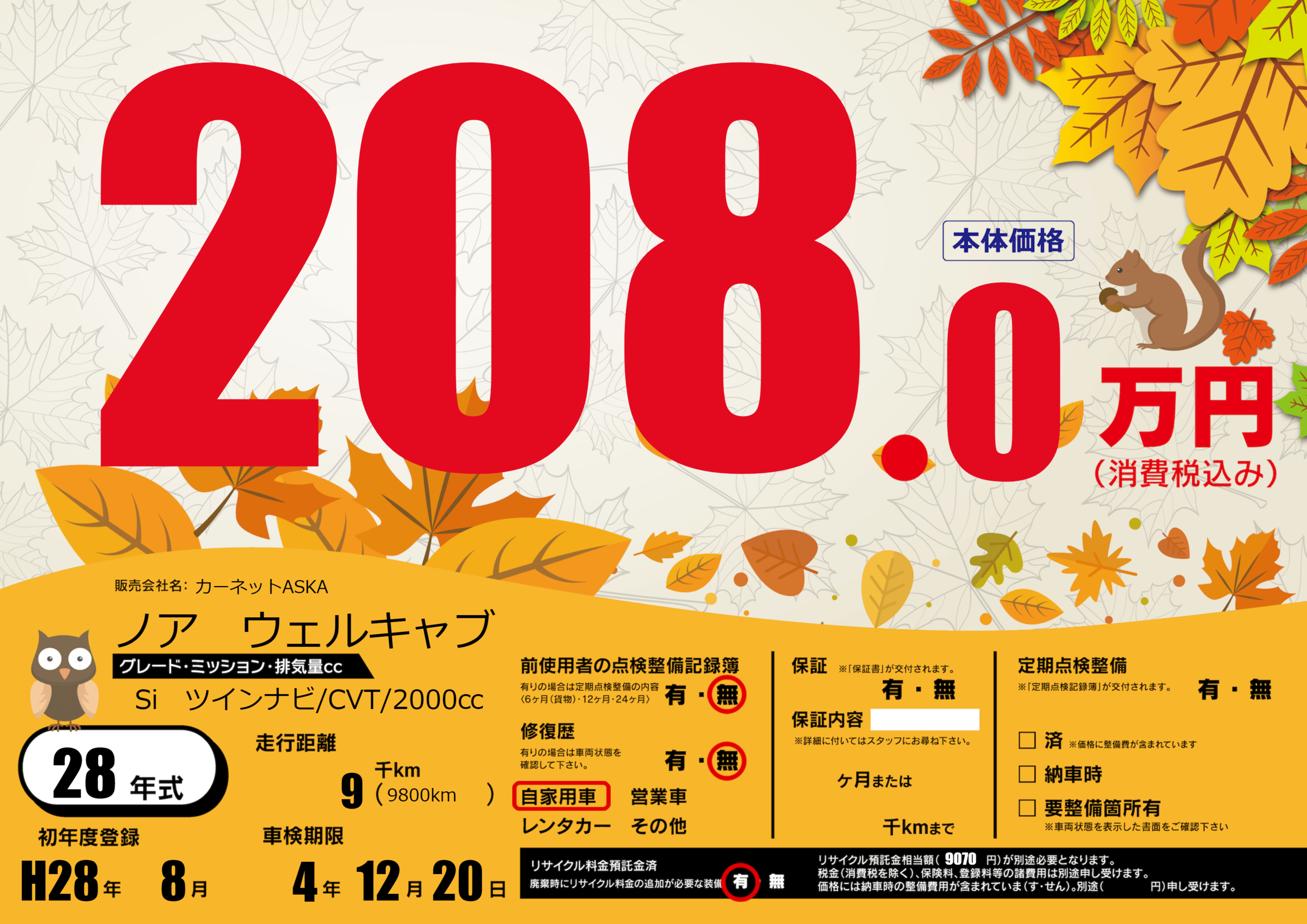 | 走行キロ | 0.9万km | 初年度登録 | H28年8月 |