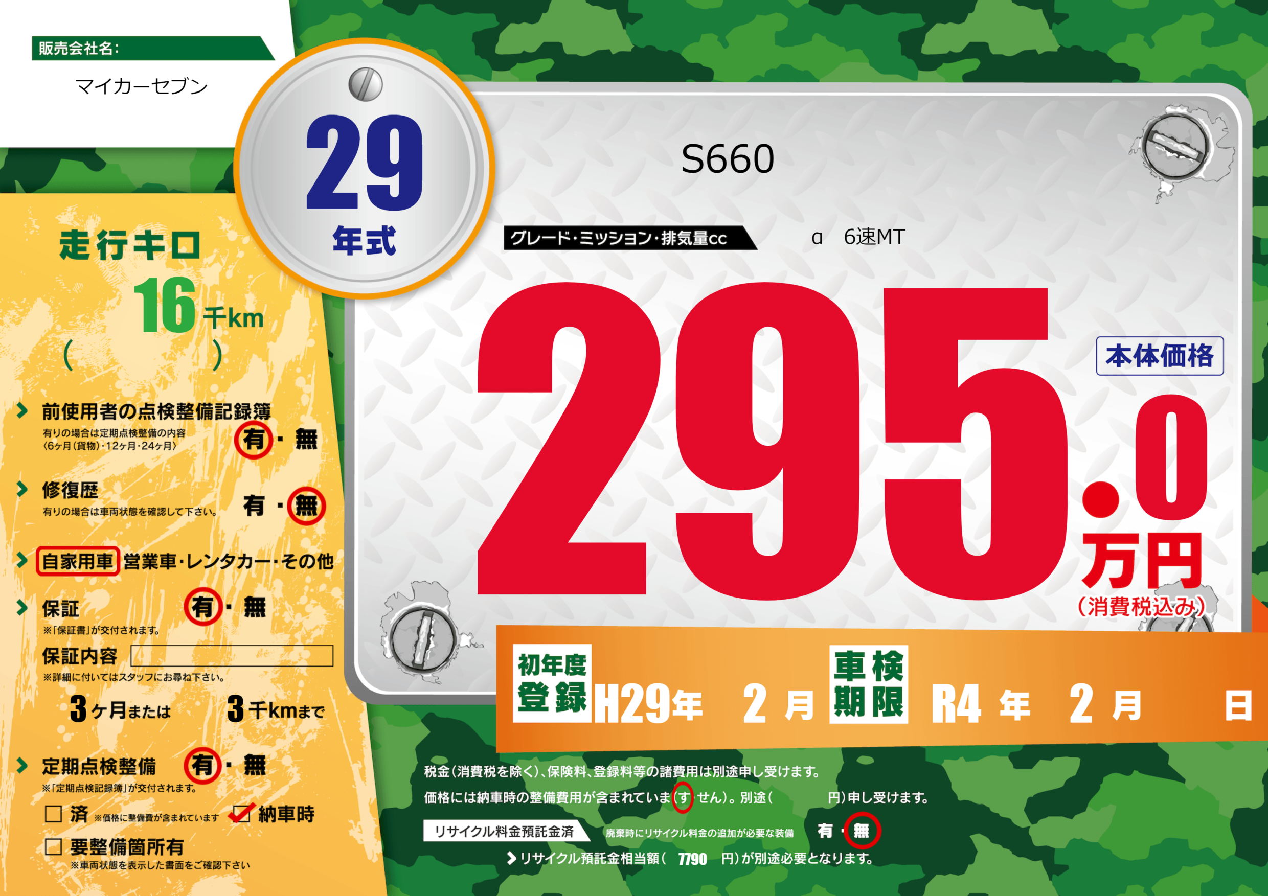 | 定期点検整備 | 定期点検整備あり 納車時あり | ||