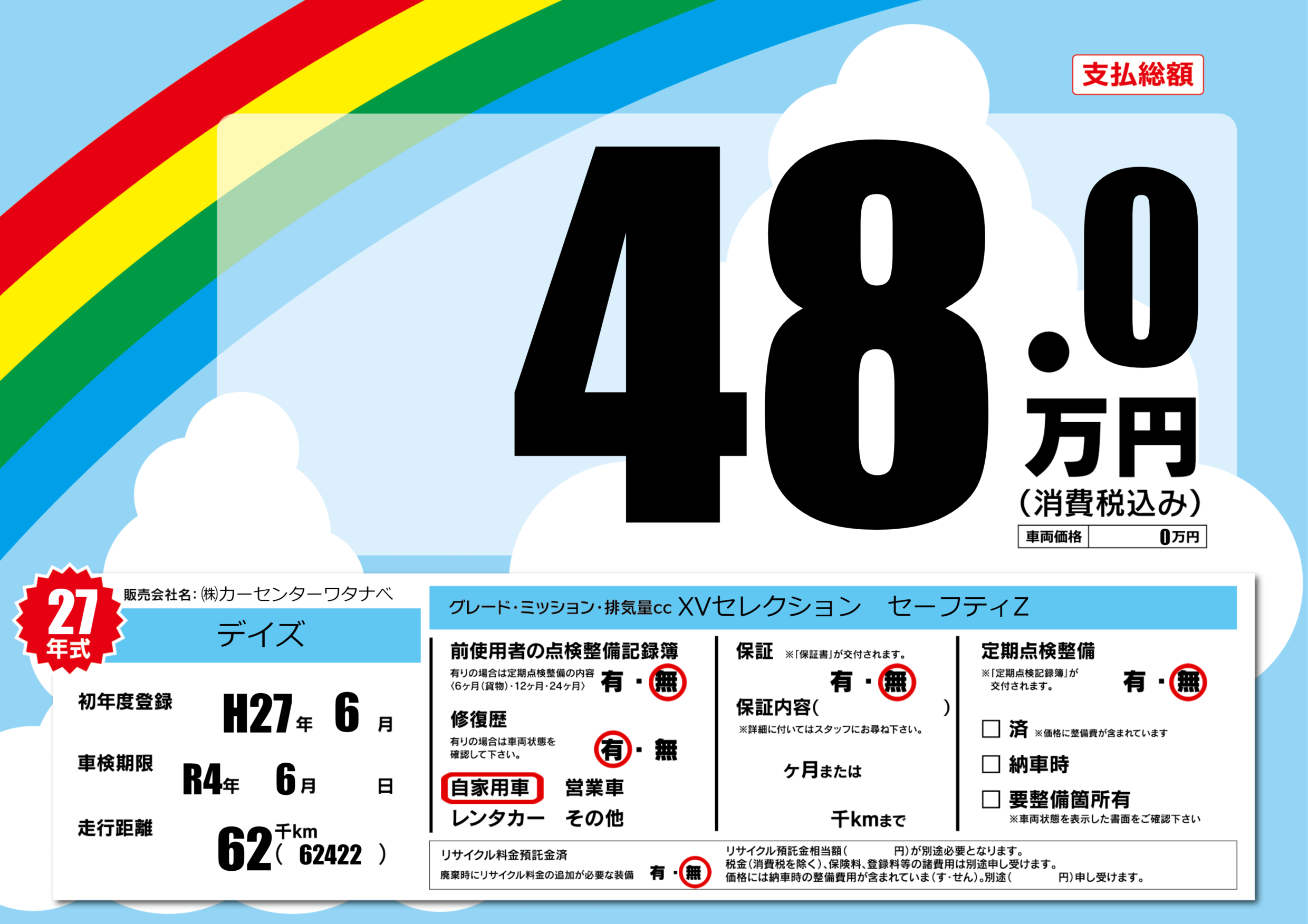 | 走行キロ | 6.2万km | 初年度登録 | H27年6月 |