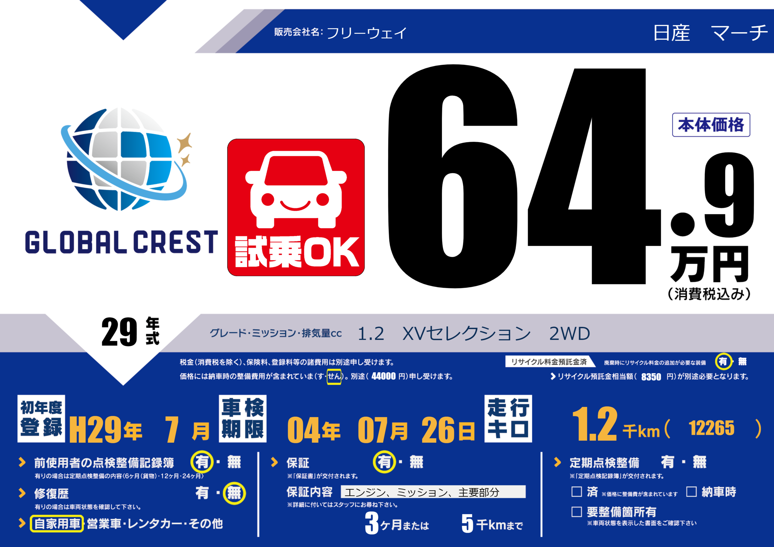 | 走行キロ | 0.1万km | 初年度登録 | H29年7月 |