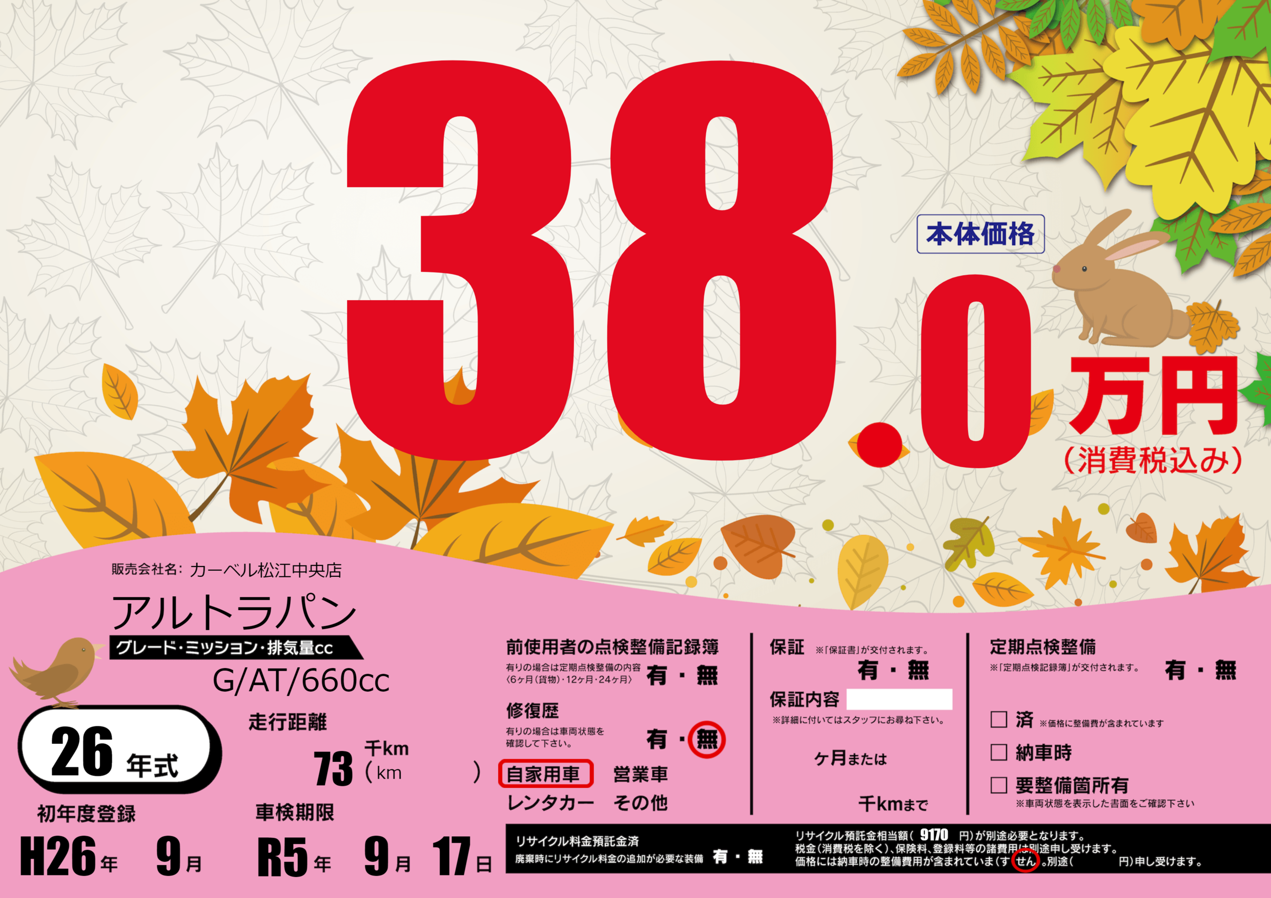 | 走行キロ | 7.3万km | 初年度登録 | H26年9月 |