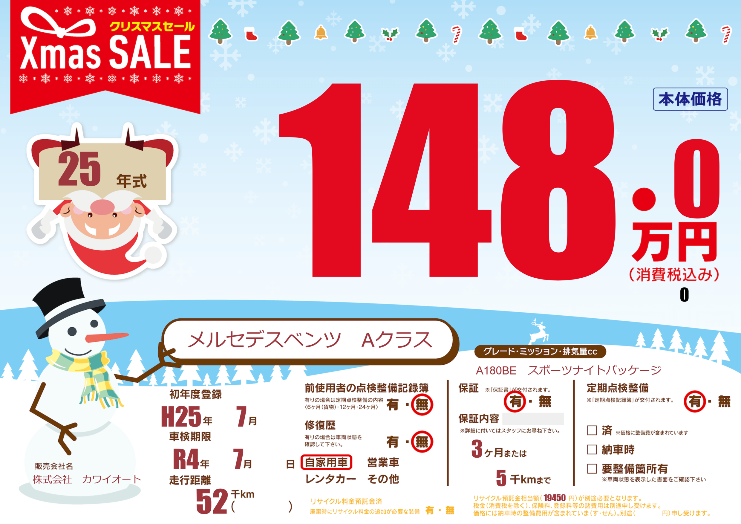 | 車名 | メルセデスベンツ Aクラス | グレード ミッション 排気量 |