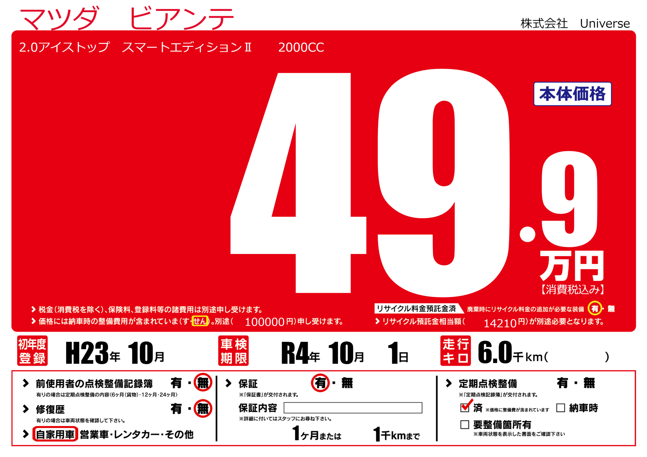 | 定期点検整備 | 定期点検整備済み | ||