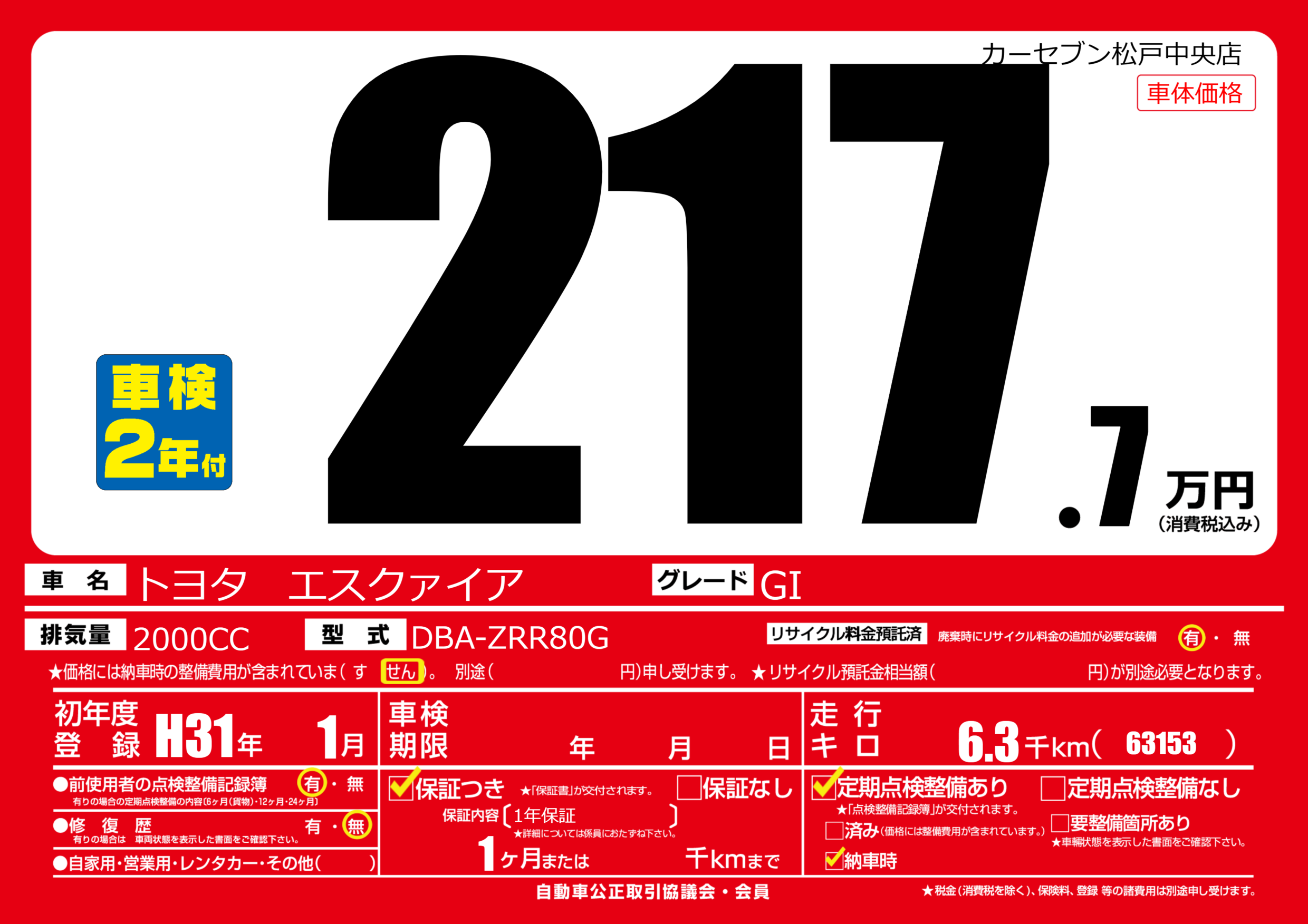 | 車名 | トヨタ エスクァイア | グレード ミッション 排気量 |