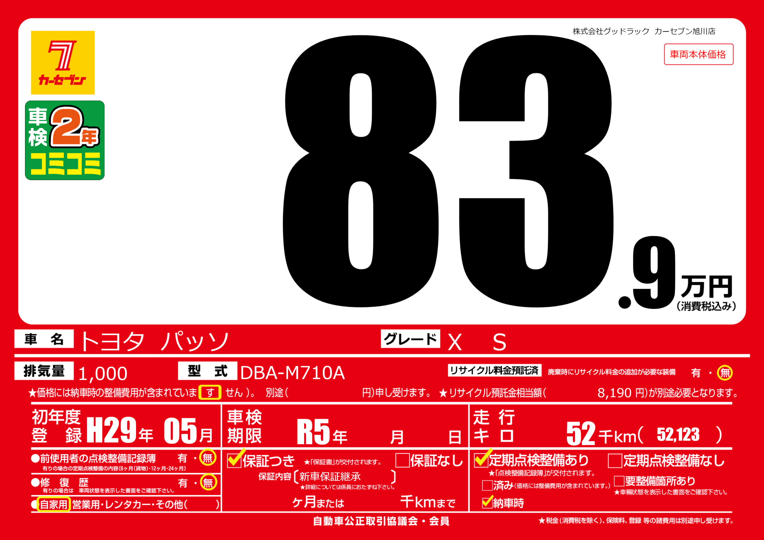 | 車名 | トヨタ パッソ | グレード ミッション 排気量 |