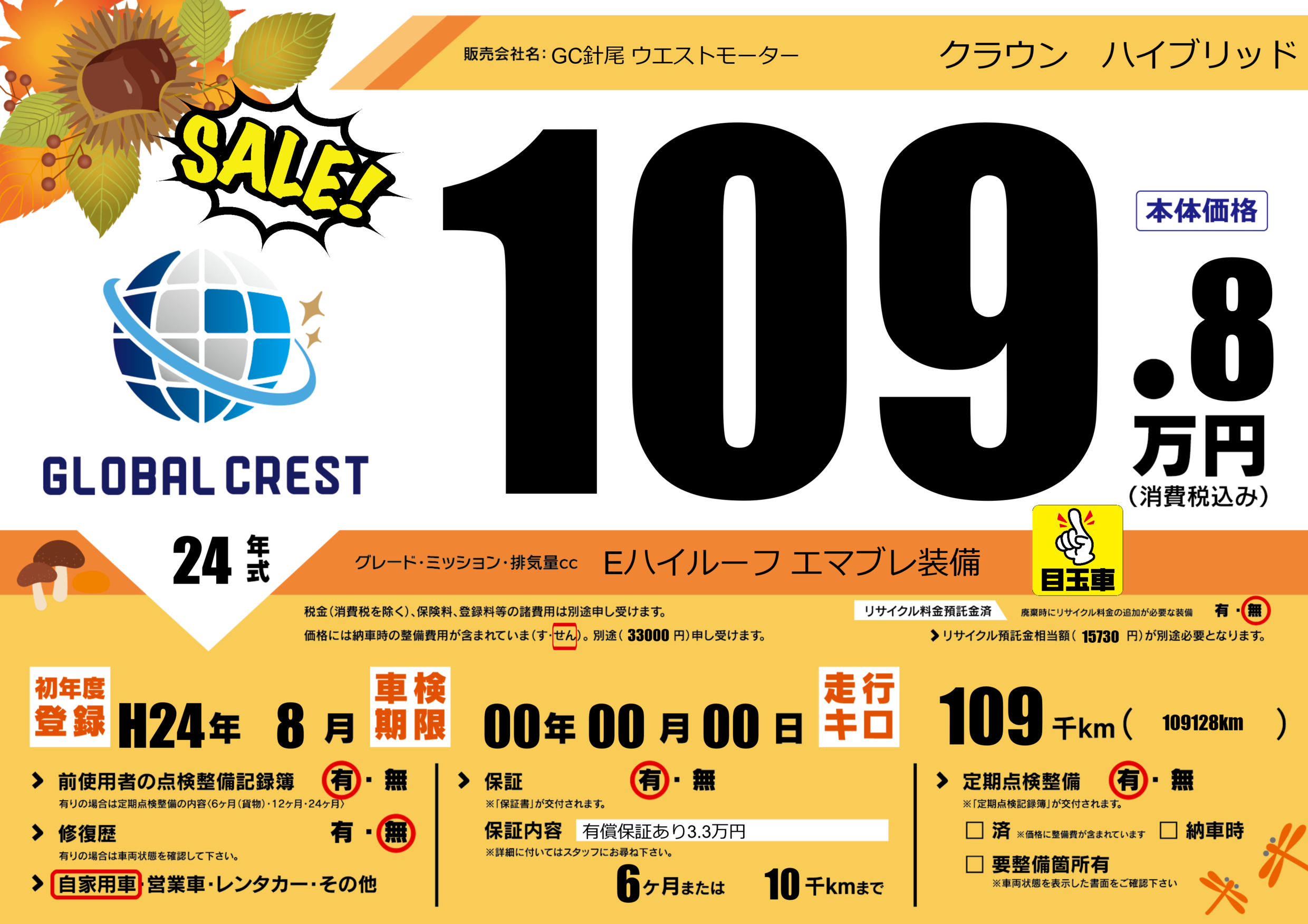 保証付き 保証内容(有償保証あり3.3万円) 6ヶ月または10千km |