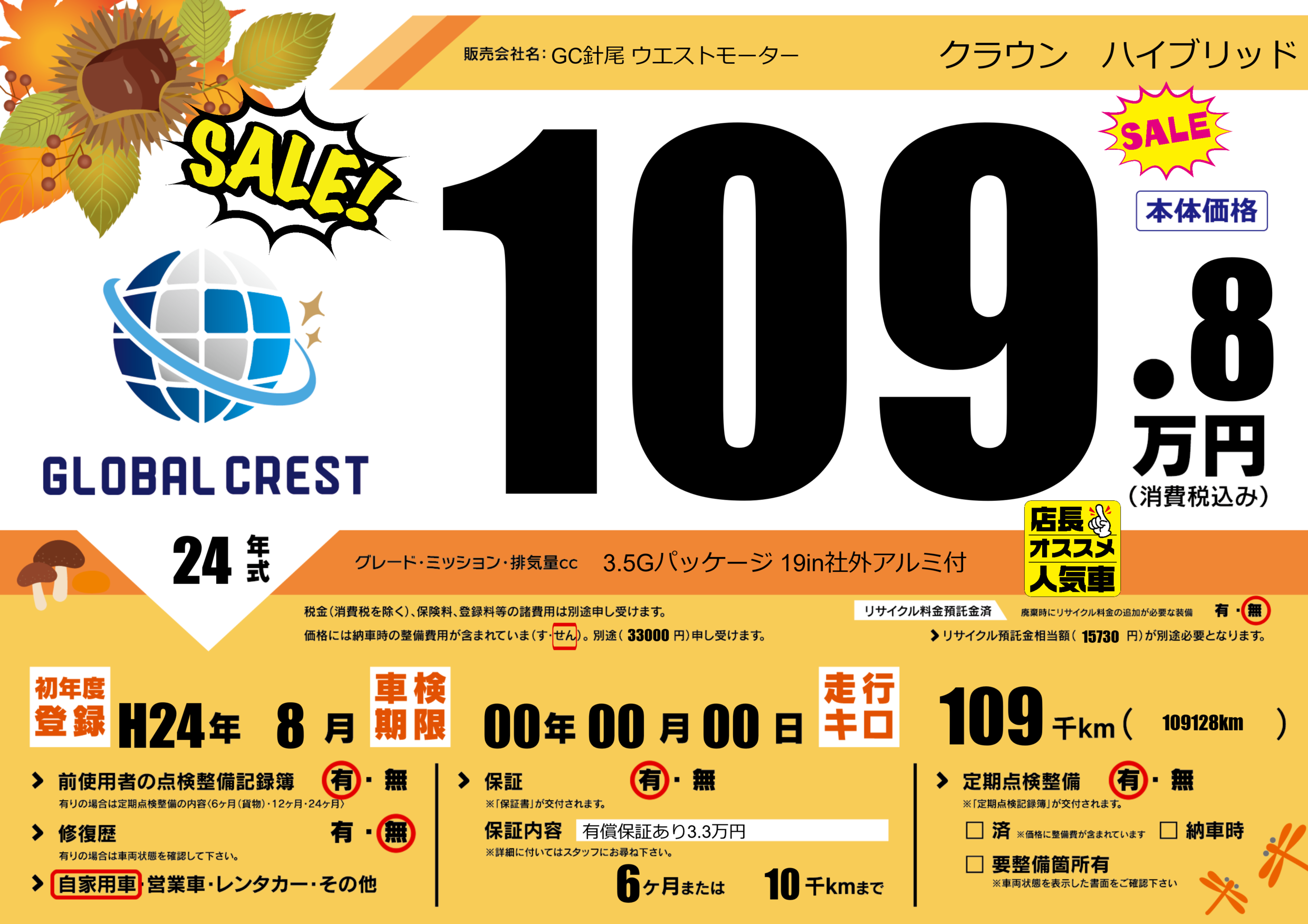 | 走行キロ | 10.9万km | 初年度登録 | H24年8月 |