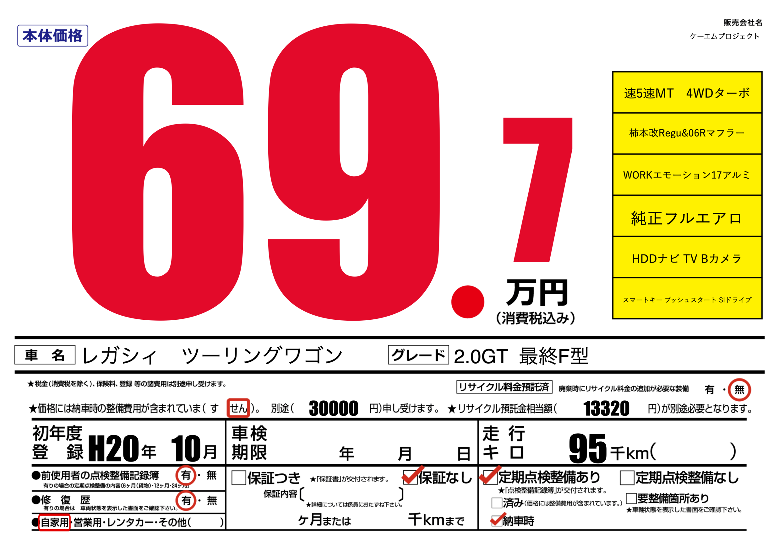 | 車名 | レガシィ ツーリングワゴン | グレード ミッション 排気量 |