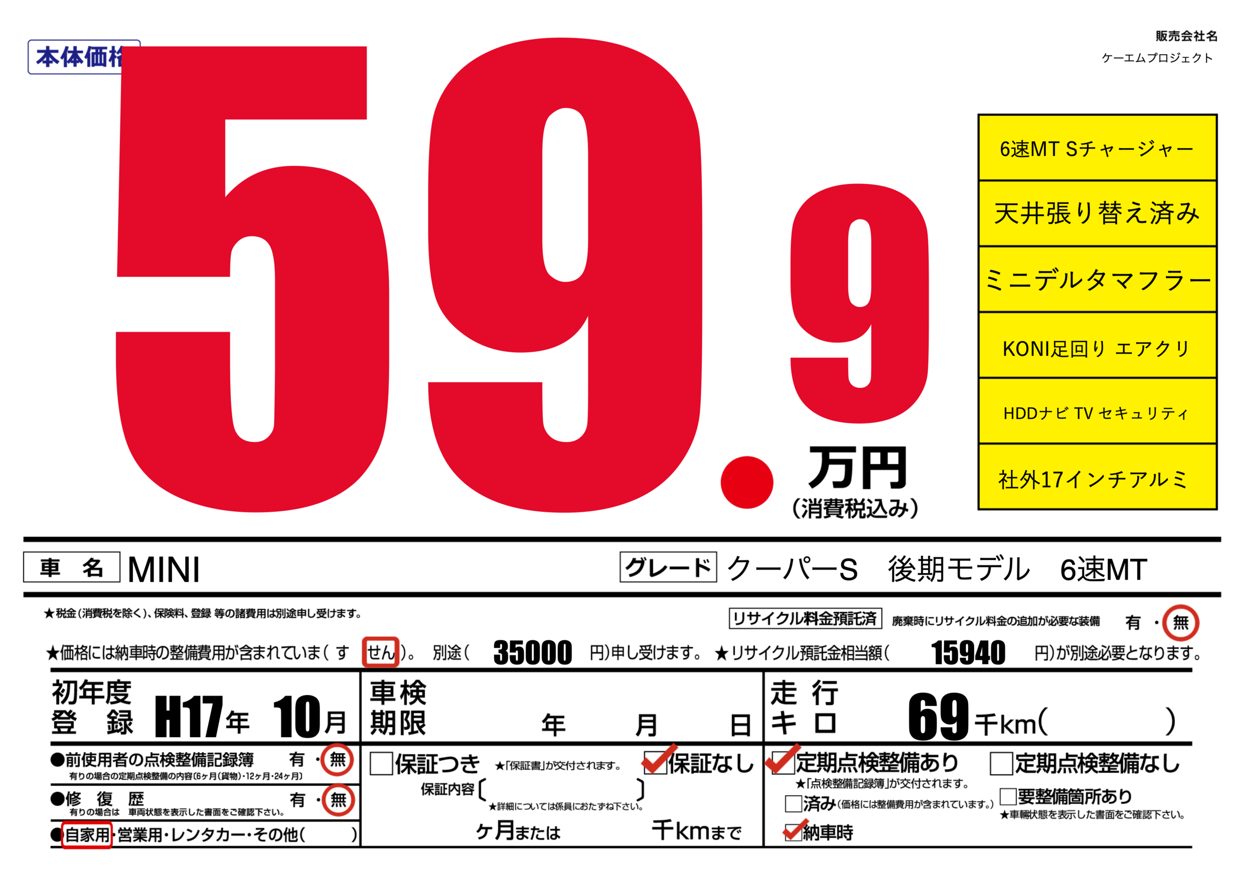 | 走行キロ | 6.9万km | 初年度登録 | H17年10月 |
