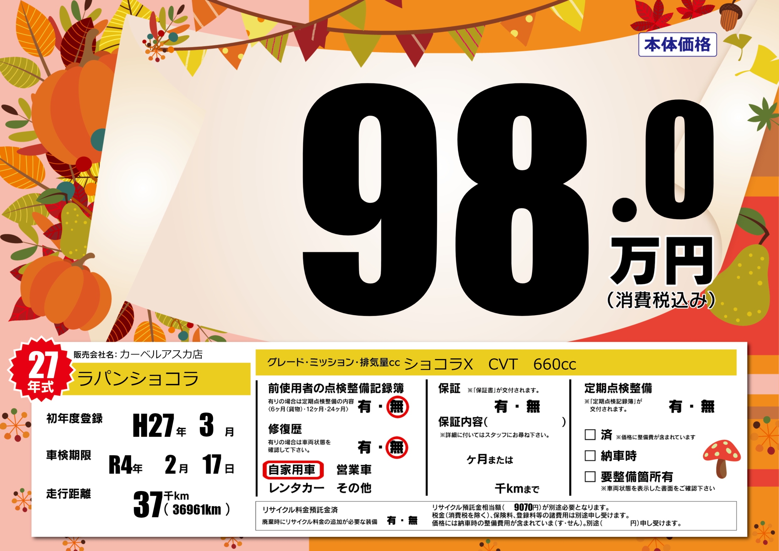 | 走行キロ | 3.7万km | 初年度登録 | H27年3月 |