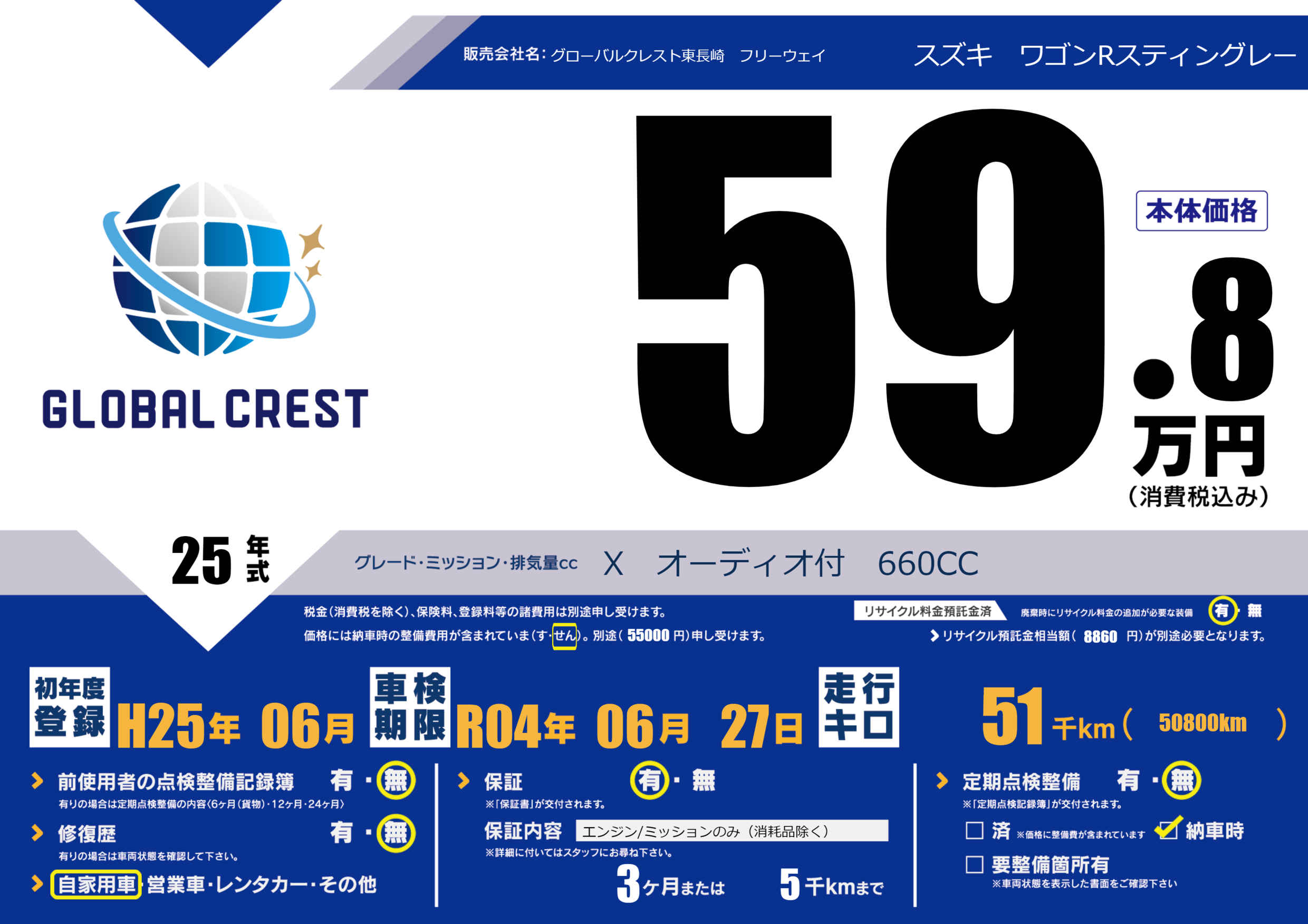 | 車名 | スズキ ワゴンRスティングレー | グレード ミッション 排気量 |