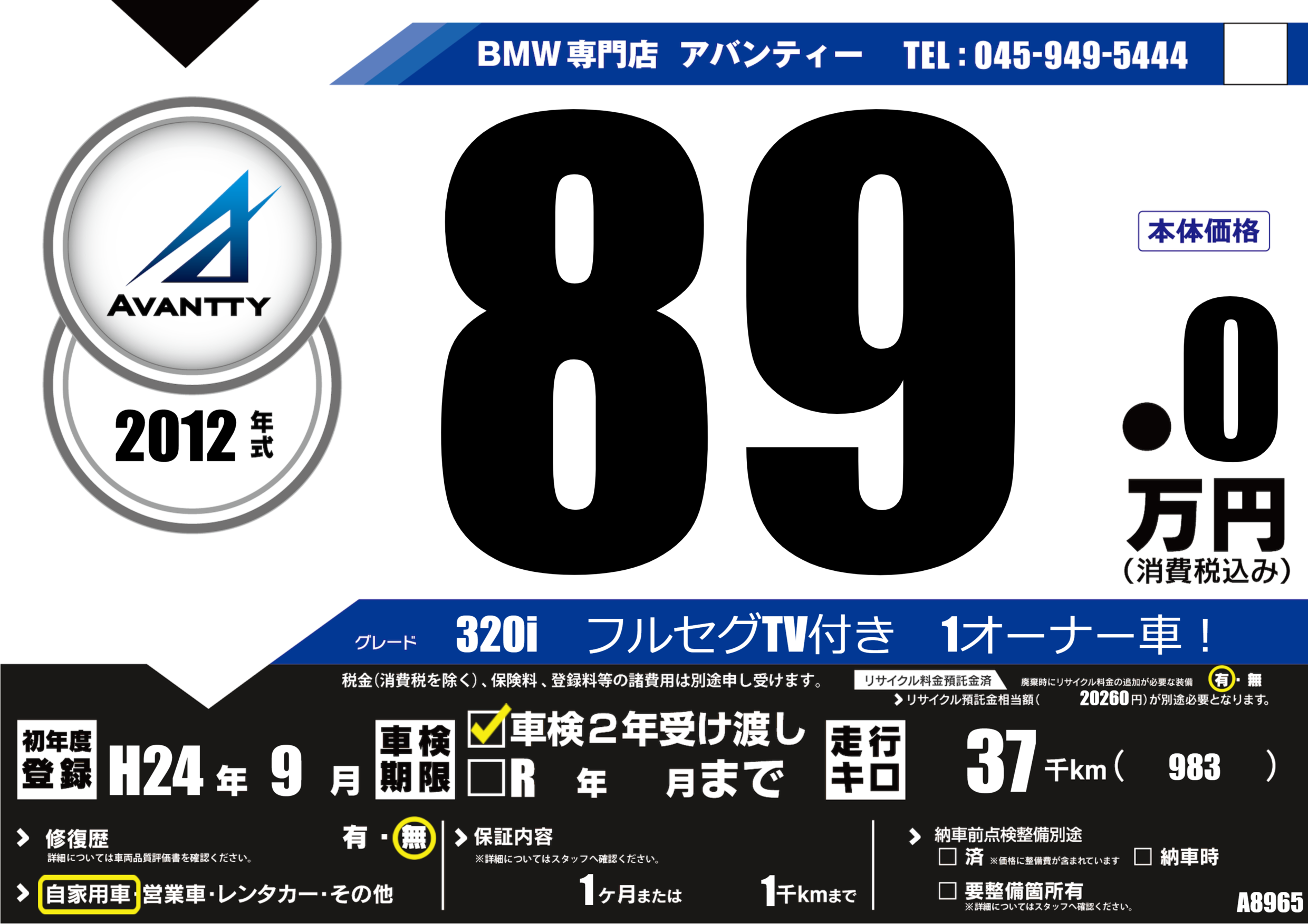 | 走行キロ | 3.7万km | 初年度登録 | H24年9月 |
