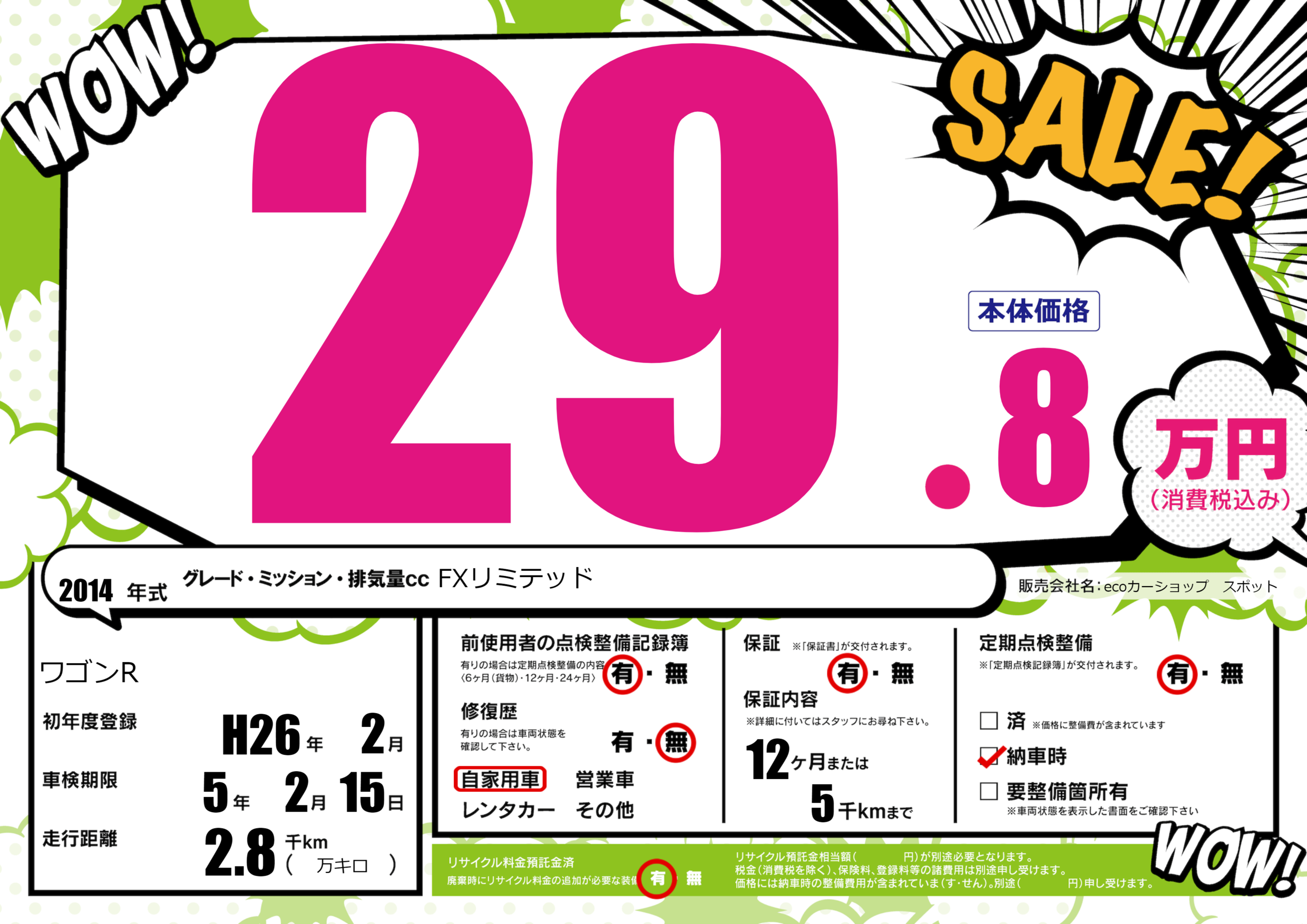 | 車名 | ワゴンR | グレード ミッション 排気量 |