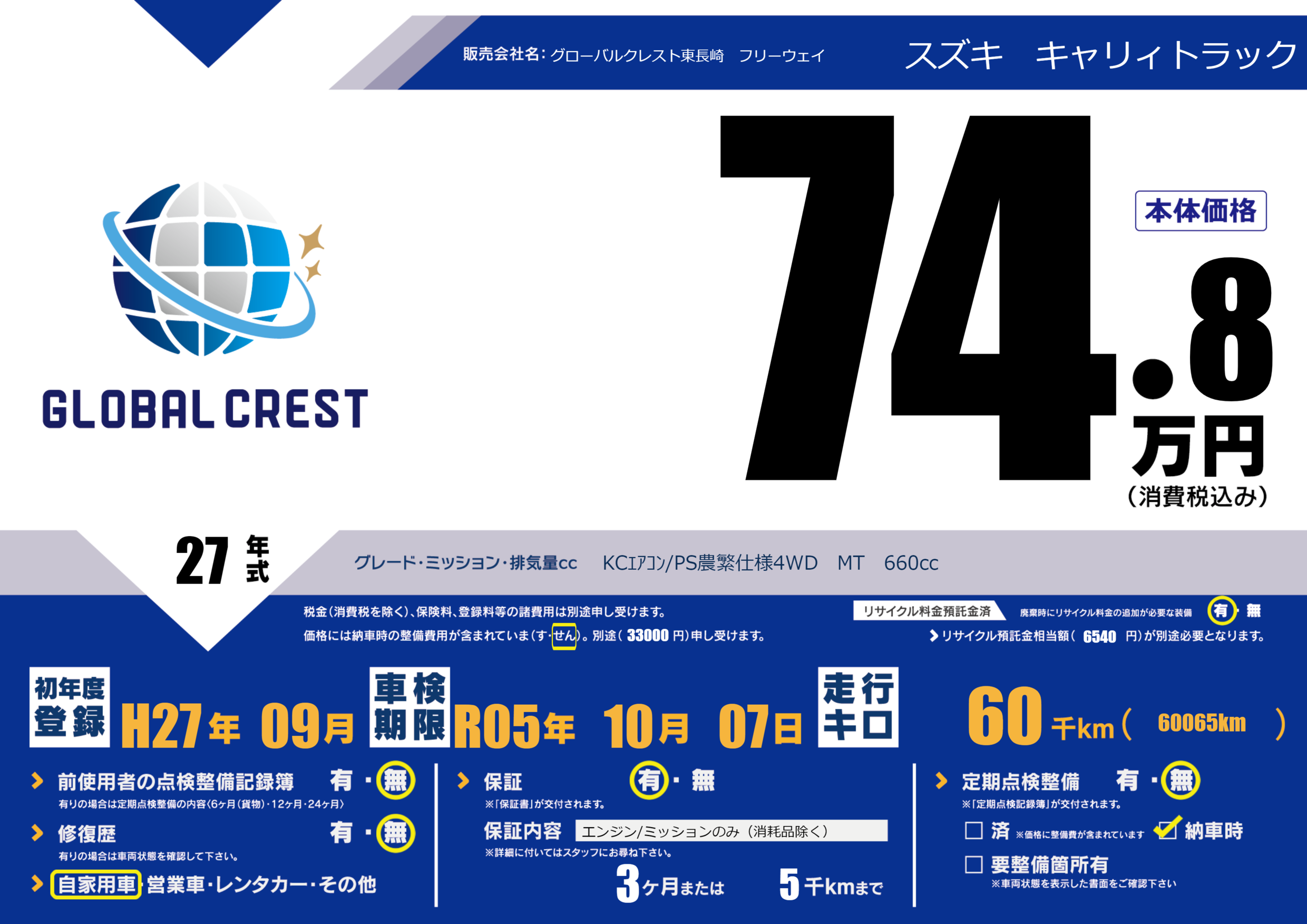| 車名 | スズキ キャリィトラック | グレード ミッション 排気量 |