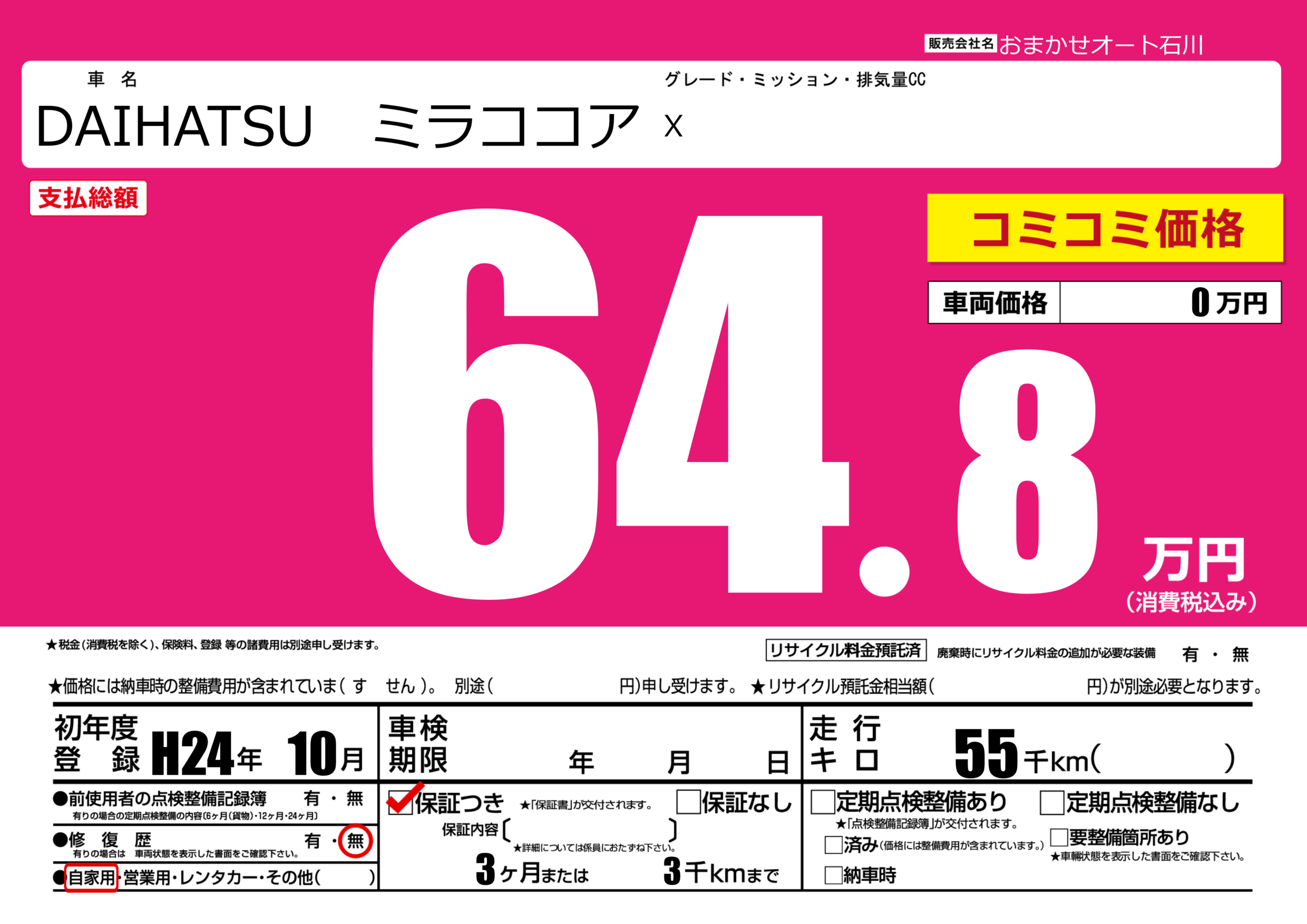 保証付き 保証内容(---) 3ヶ月または(3)千kmまで |