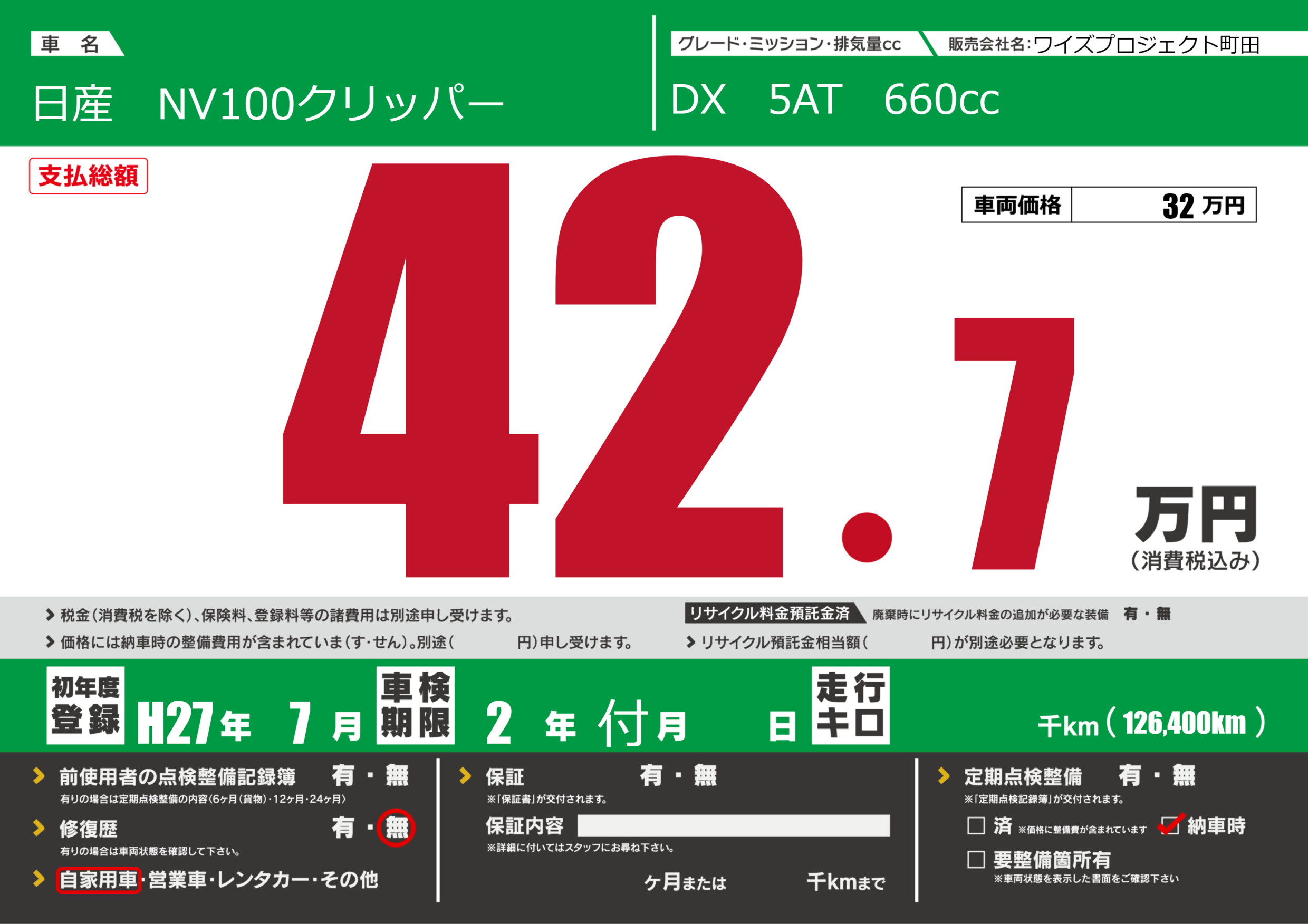 | 走行キロ | - | 初年度登録 | H27年7月 |