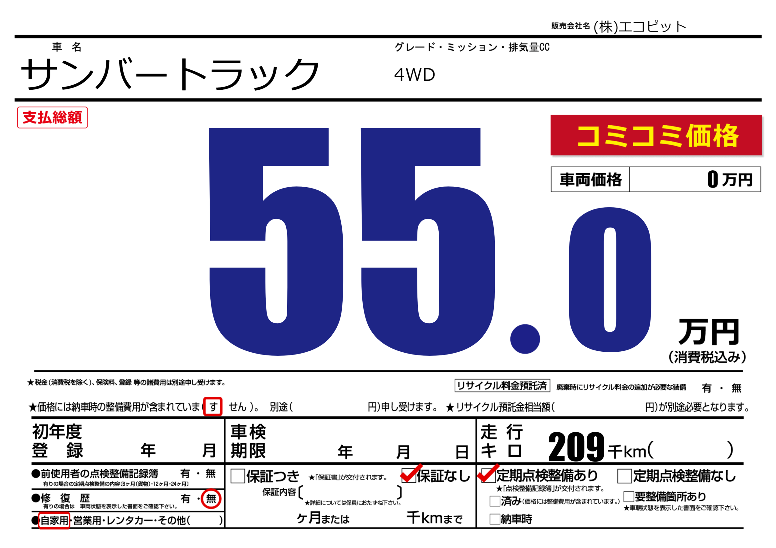 | 車名 | サンバートラック | グレード ミッション 排気量 |
