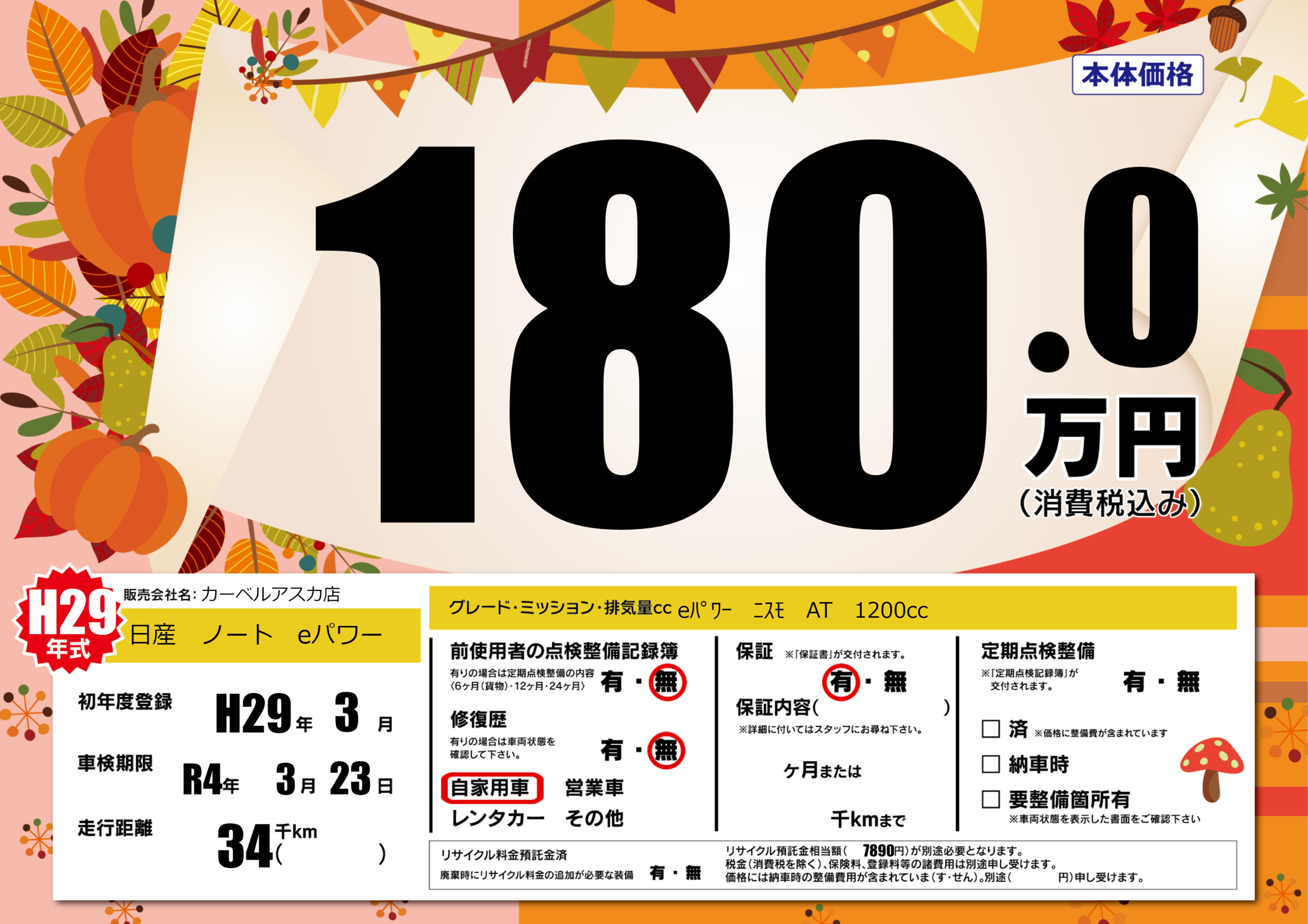 | 車名 | 日産 ノート eパワー | グレード ミッション 排気量 |