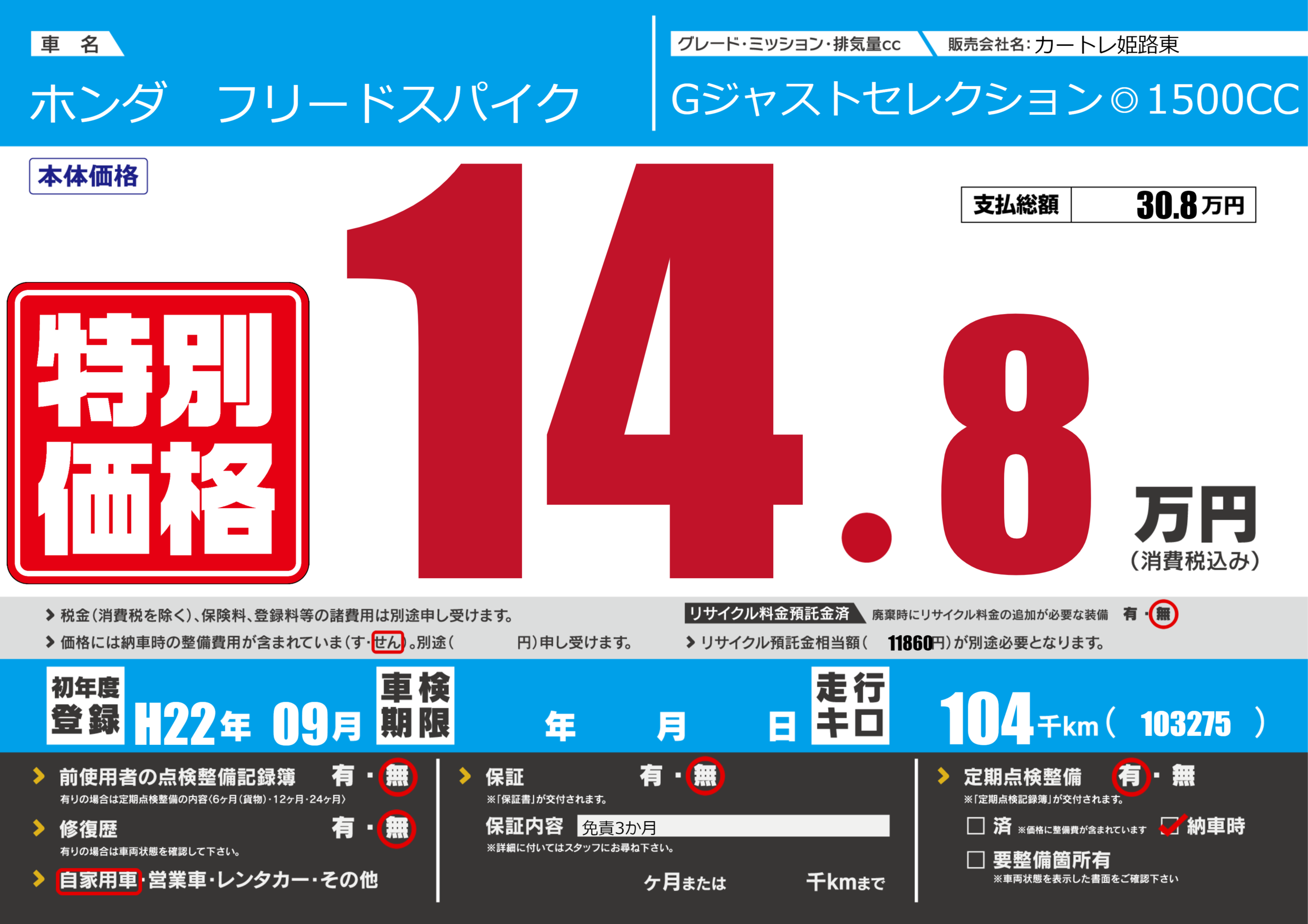 | 車名 | ホンダ フリードスパイク | グレード ミッション 排気量 |