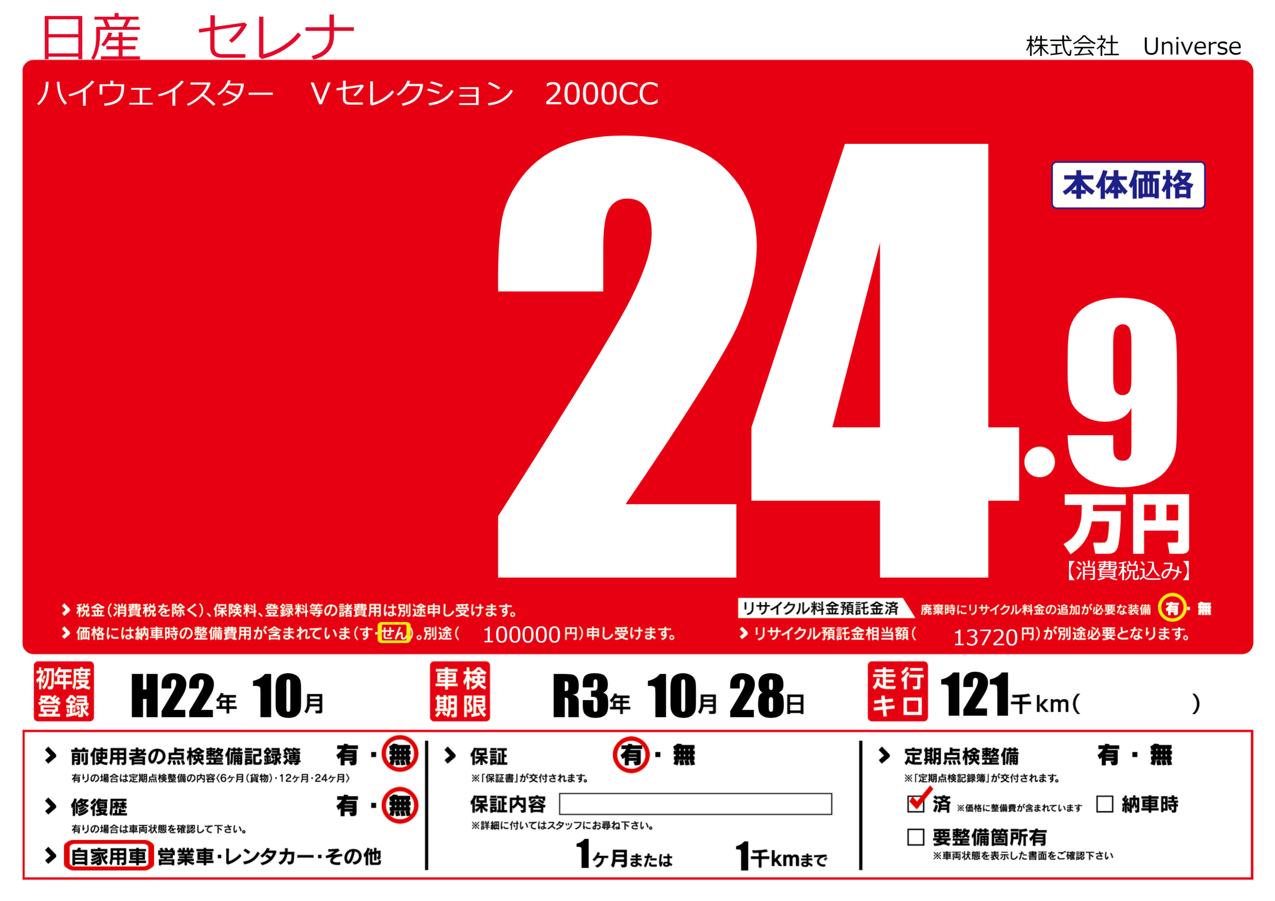 | 走行キロ | 12.1万km | 初年度登録 | H22年10月 |