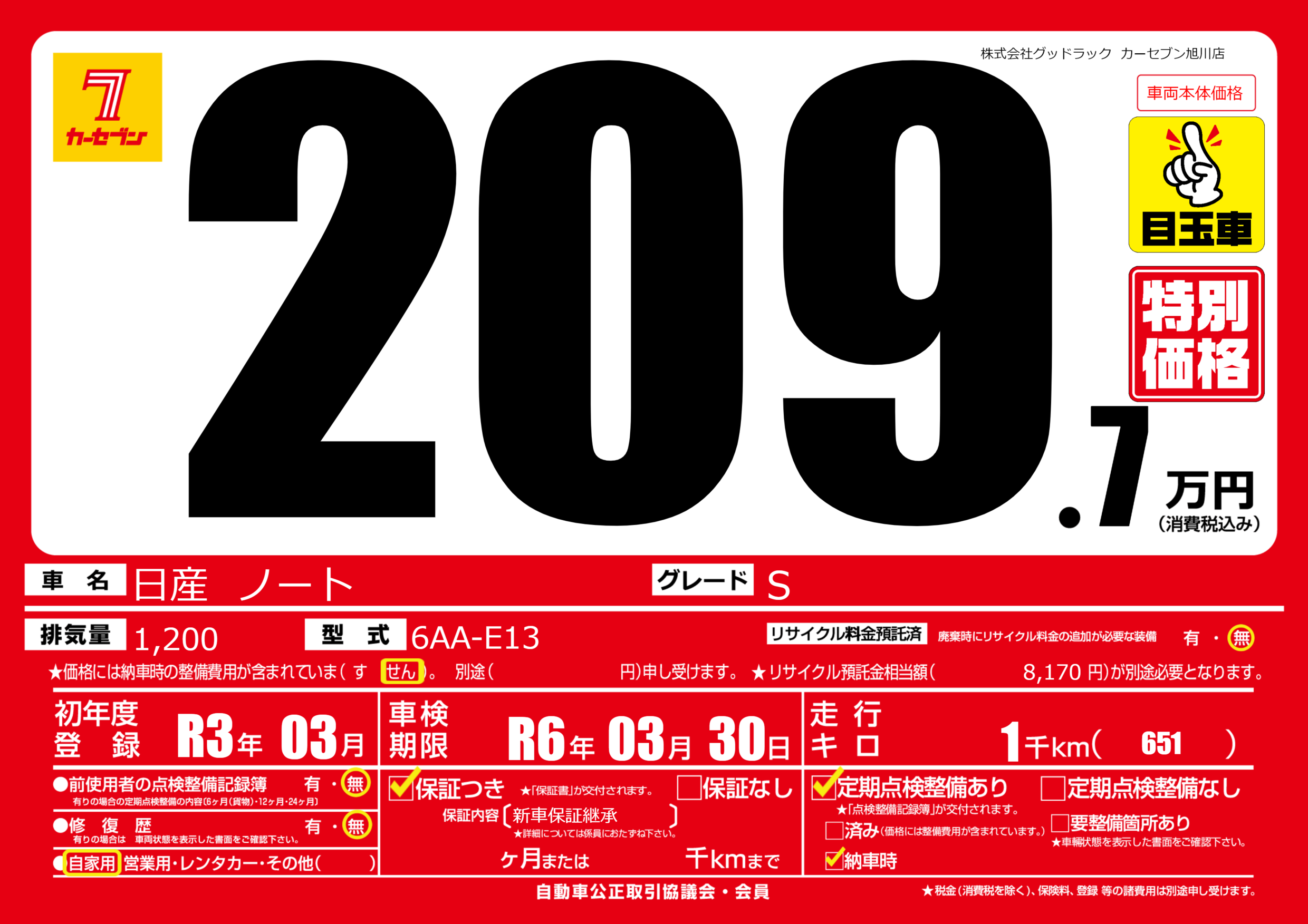 | 走行キロ | 0.1万km | 初年度登録 | R3年03月 |