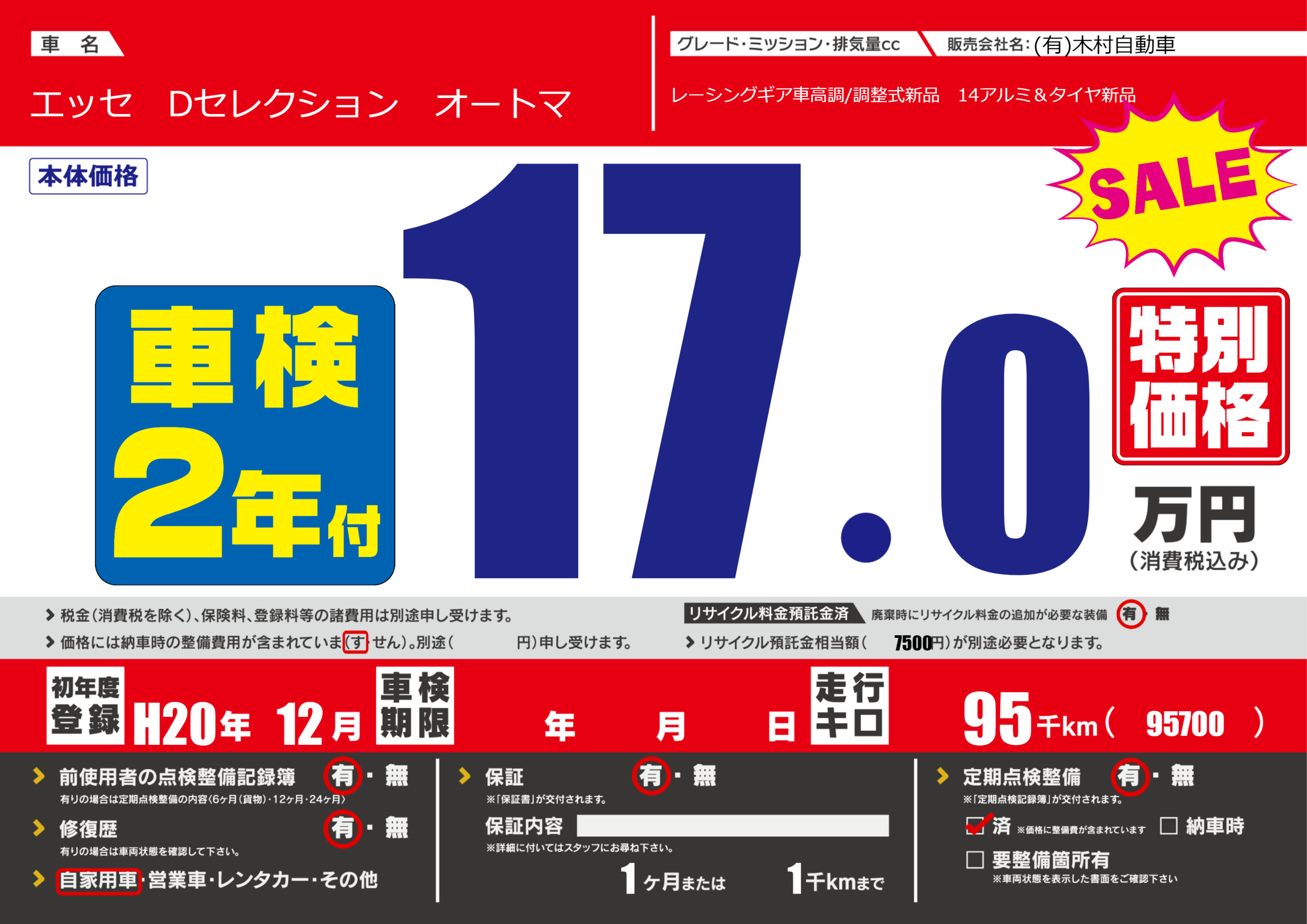 | 定期点検整備 | 定期点検整備あり 定期点検整備済み | ||
