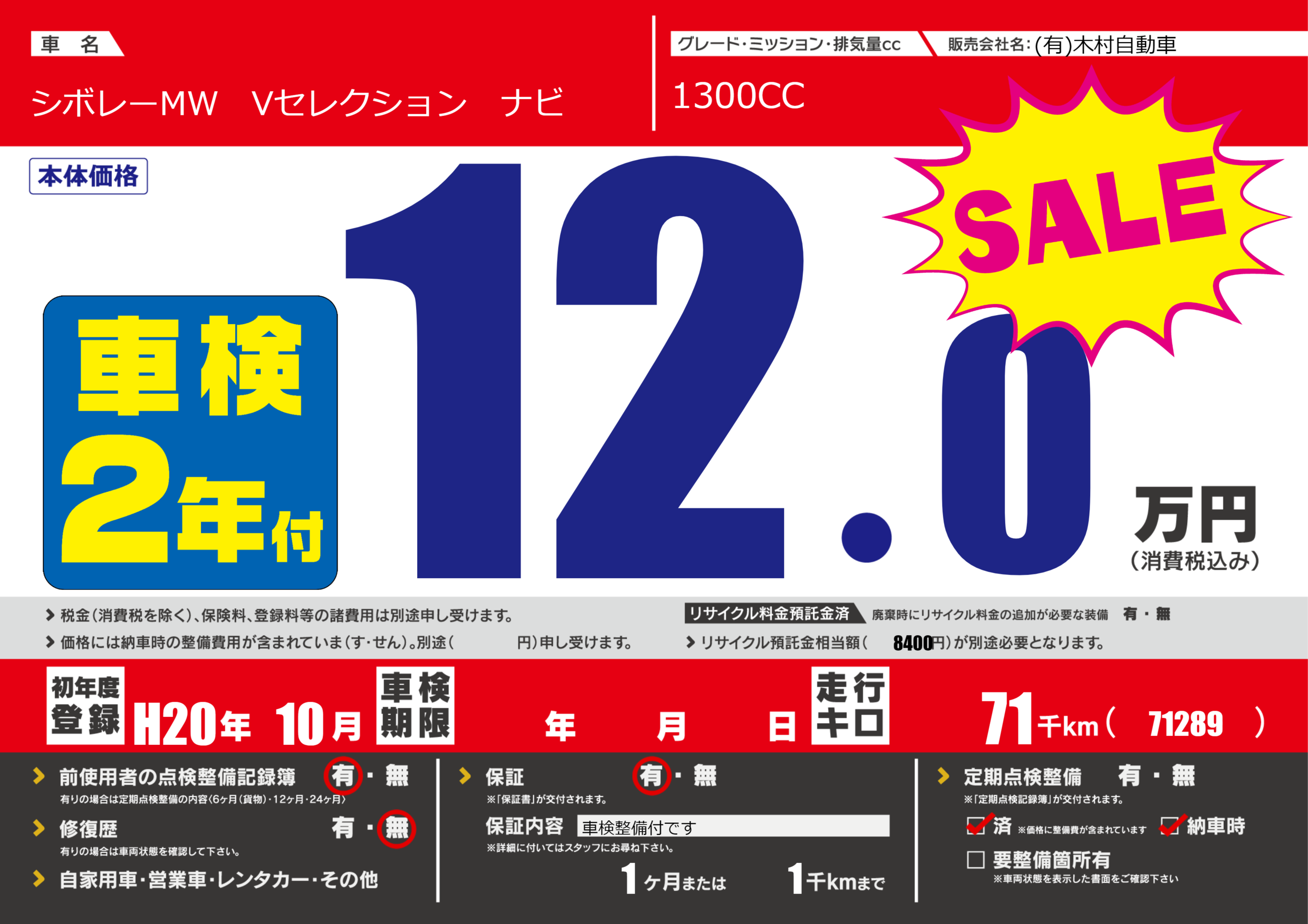 | 走行キロ | 7.1万km | 初年度登録 | H20年10月 |