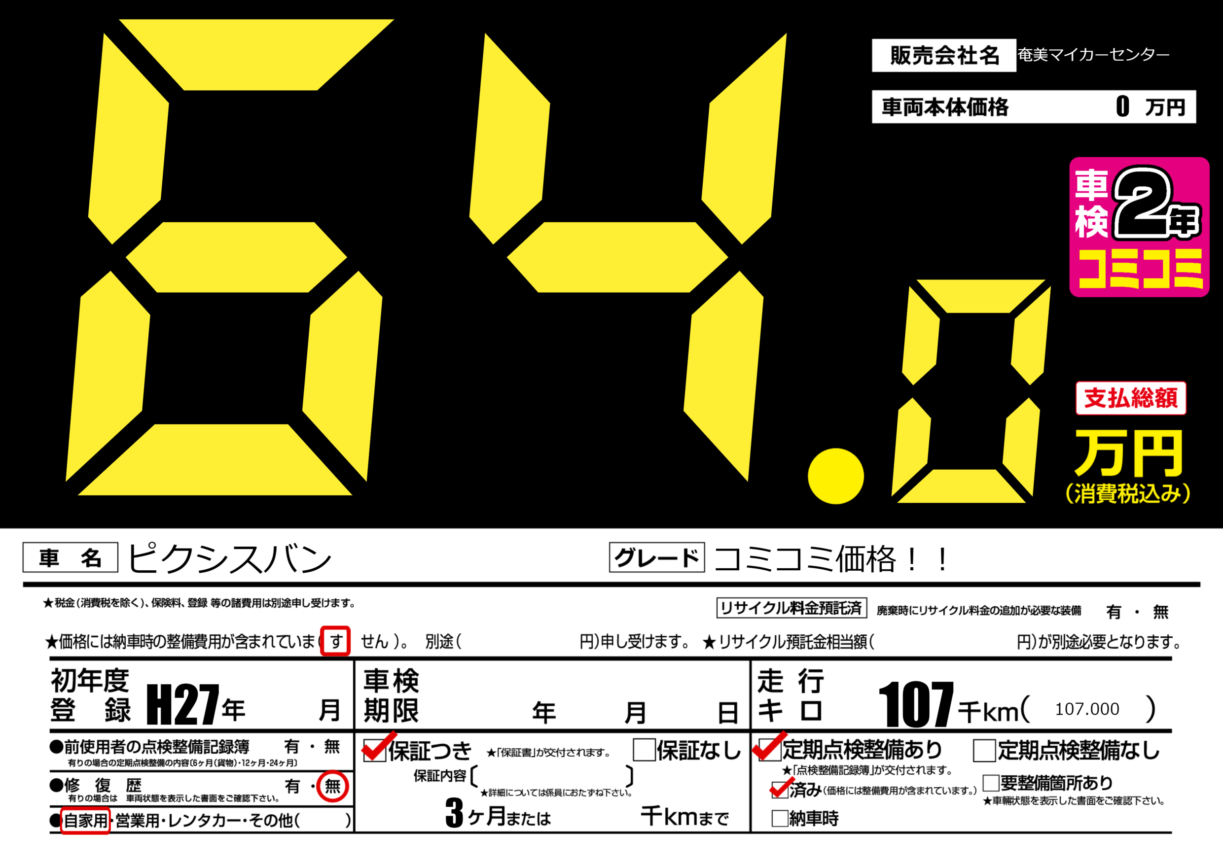 | 定期点検整備 | 定期点検整備あり 定期点検整備済み | ||