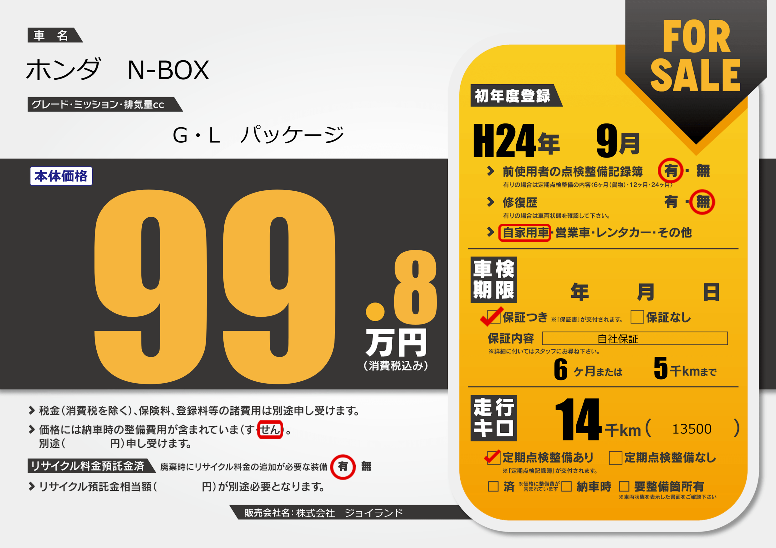 保証付き 保証内容( 自社保証) 6ヶ月または(5)千kmまで |