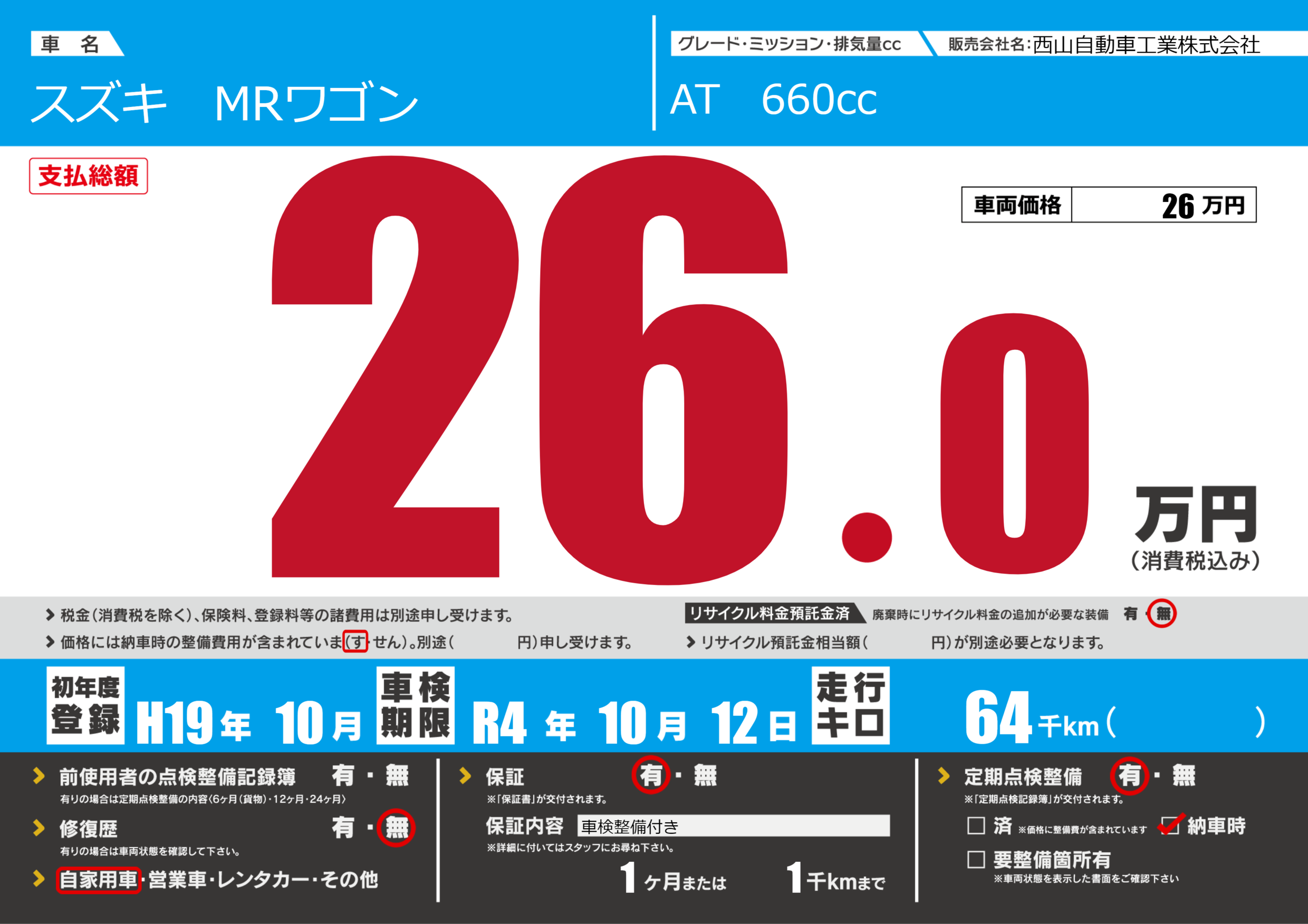 | 定期点検整備 | 定期点検整備あり 納車時あり | ||